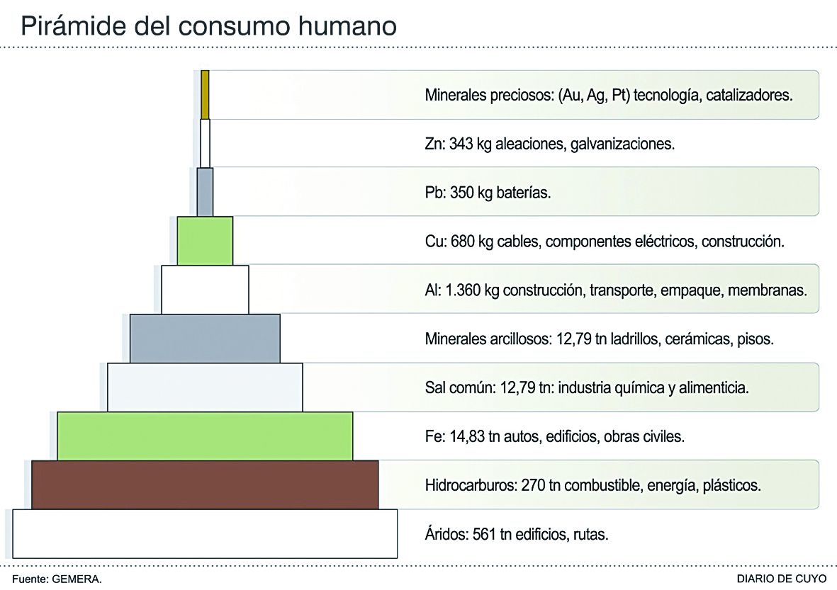 Según datos aportados por el Grupo de Empresas Exploradoras de la República Argentina (Gemera), una persona utiliza en promedio unas 873 toneladas de minerales a lo largo de su vida. La enorme cifra toma como referencia los elementos que emplea un ser humano diariamente, durante 365 días, a lo largo de 70 años de vida en un país industrializado.