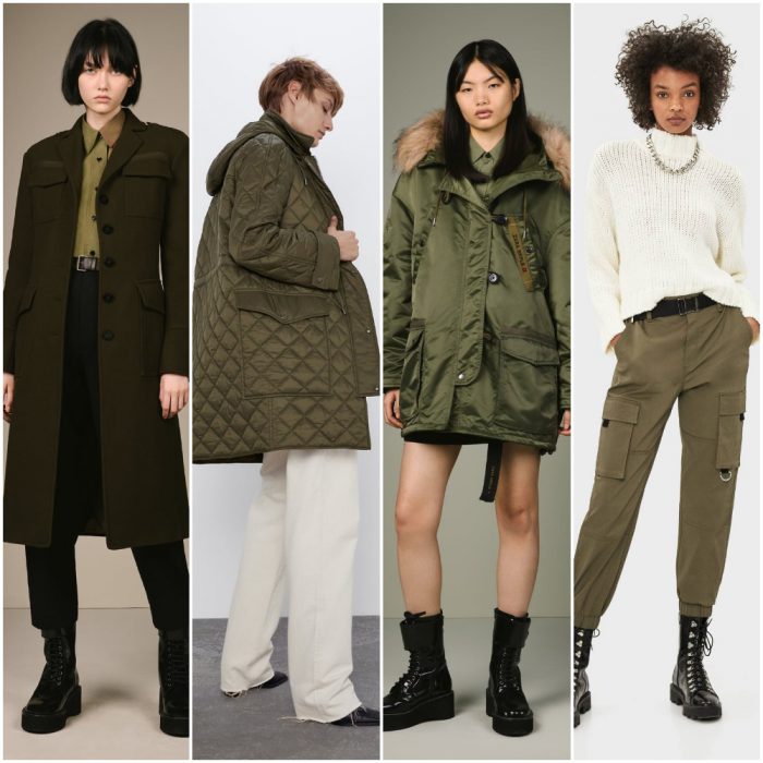 Los que reflejan los uniformes del ejército y el equipo militar, en chaquetas bomber verde oliva con faldas o pantalones a juego.