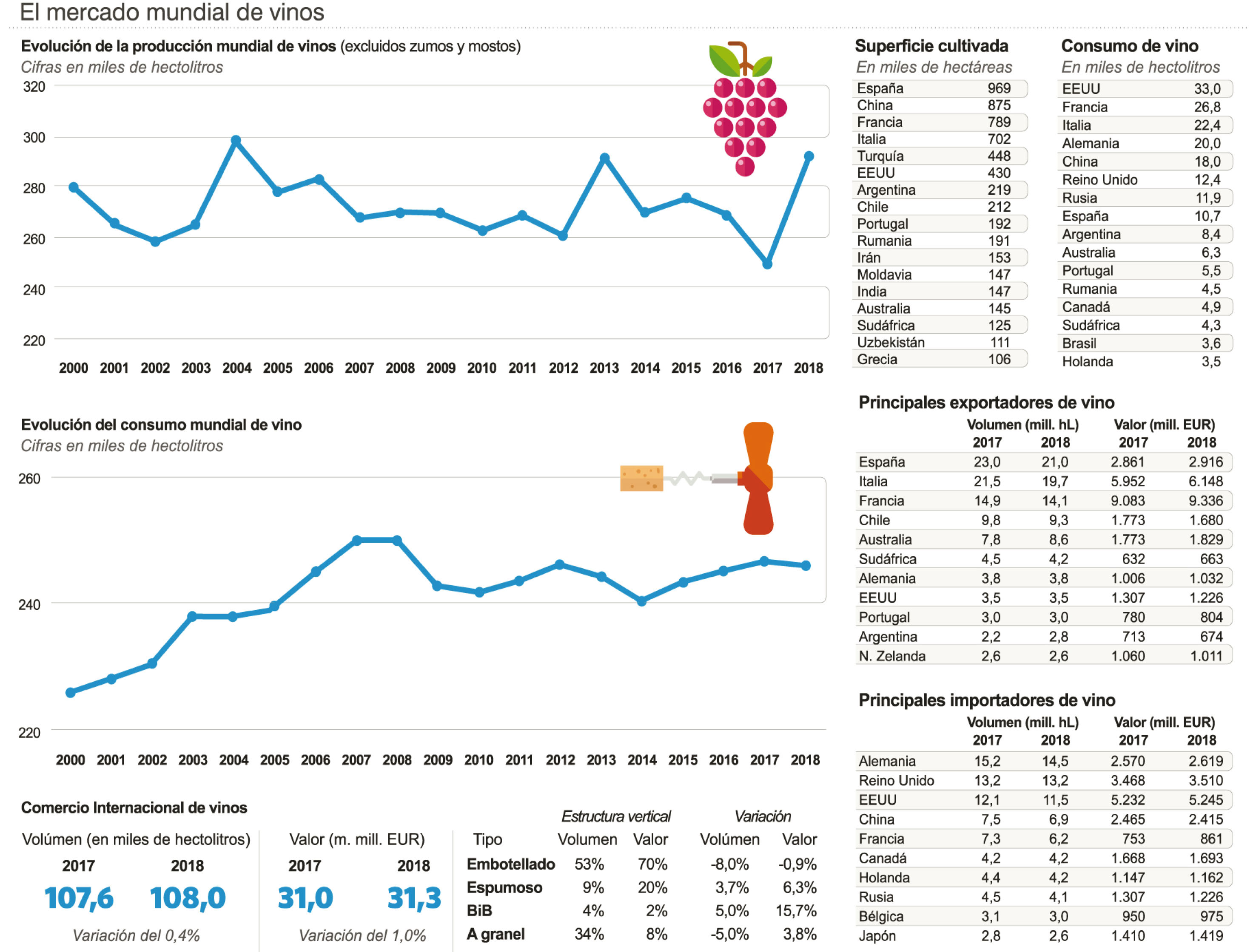 - Una producción que alcanza los 292,3 millones de hectolitros, lo que representa un aumento de 42,5 millones de hectolitros (hl) con respecto a 2017.