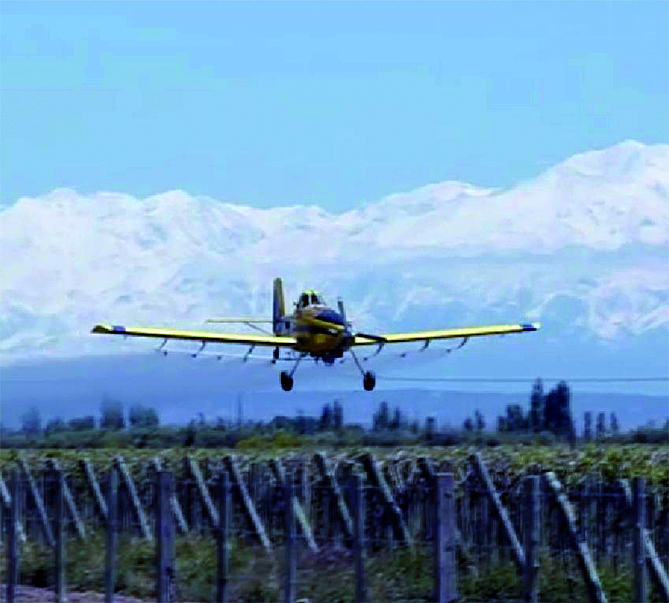 La aplicación de insecticidas contra Lobesia botrana o polilla de la vid mediante aviones fumigadores es una técnica efectiva que permite abarcar grandes superficies en una sola aplicación.