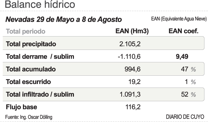 "Del análisis realizado a partir de datos volumétricos utilizando el método de EAN y de los caudales que han escurrido en el mismo período observado podemos decir que, en el caso que se mantengan las condiciones de los fenómenos de infiltración, retención, sublimación y evaporación observadas hasta aquí en lo que va del año, que la expectativa de escurrimiento de la nieve acumulada hasta el 18 de agosto es, como mínimo, del 48% del EAN acumulado, esto es el 48% de 994,6 hm3, lo cual implica una previsión de escurrimiento directo mínima de 477,4 hm3 y si sumamos el flujo base que es de 116,6 hm3, la esperanza de escurrimientos llega a 594 hm3", explica Dölling.