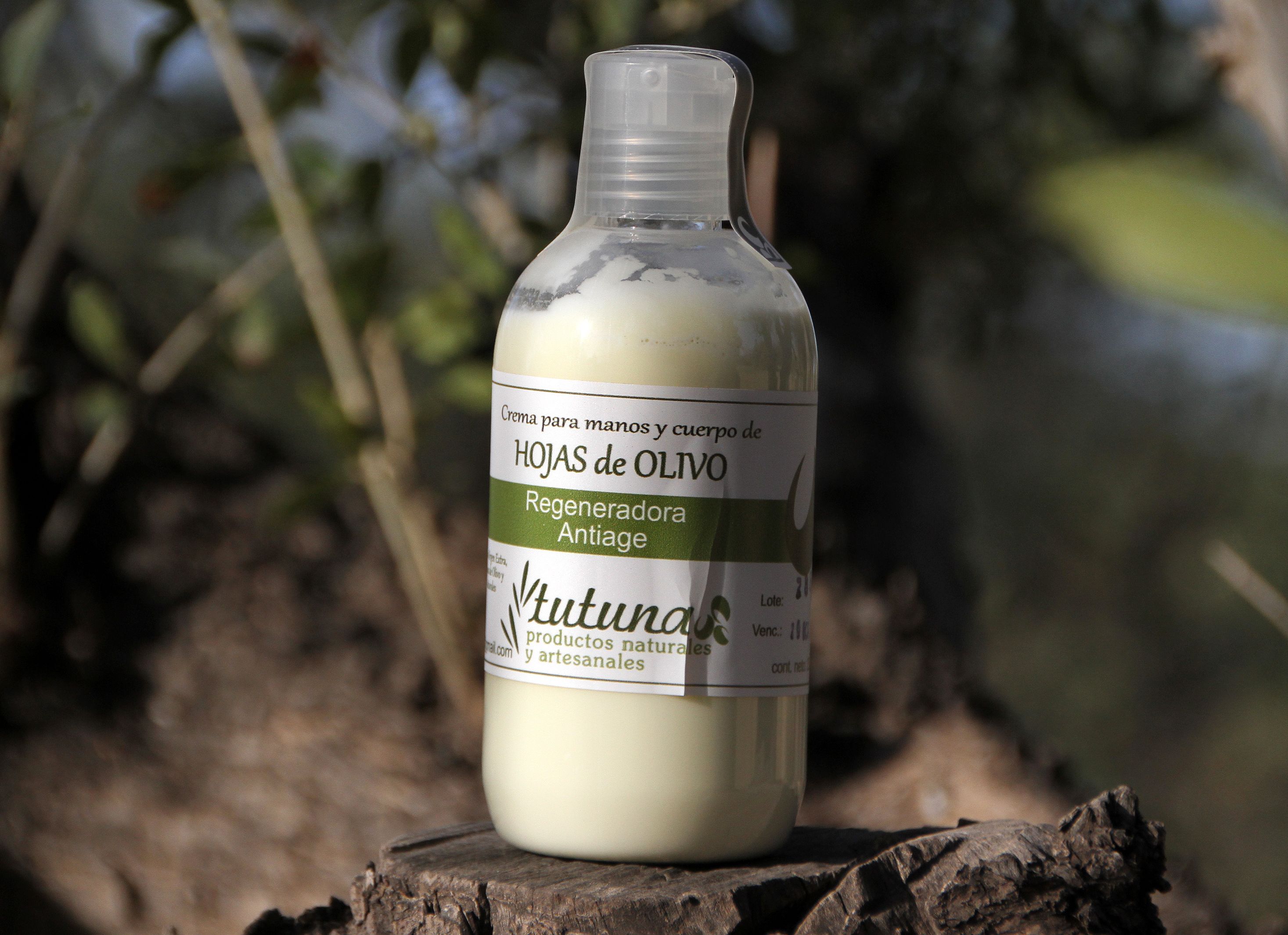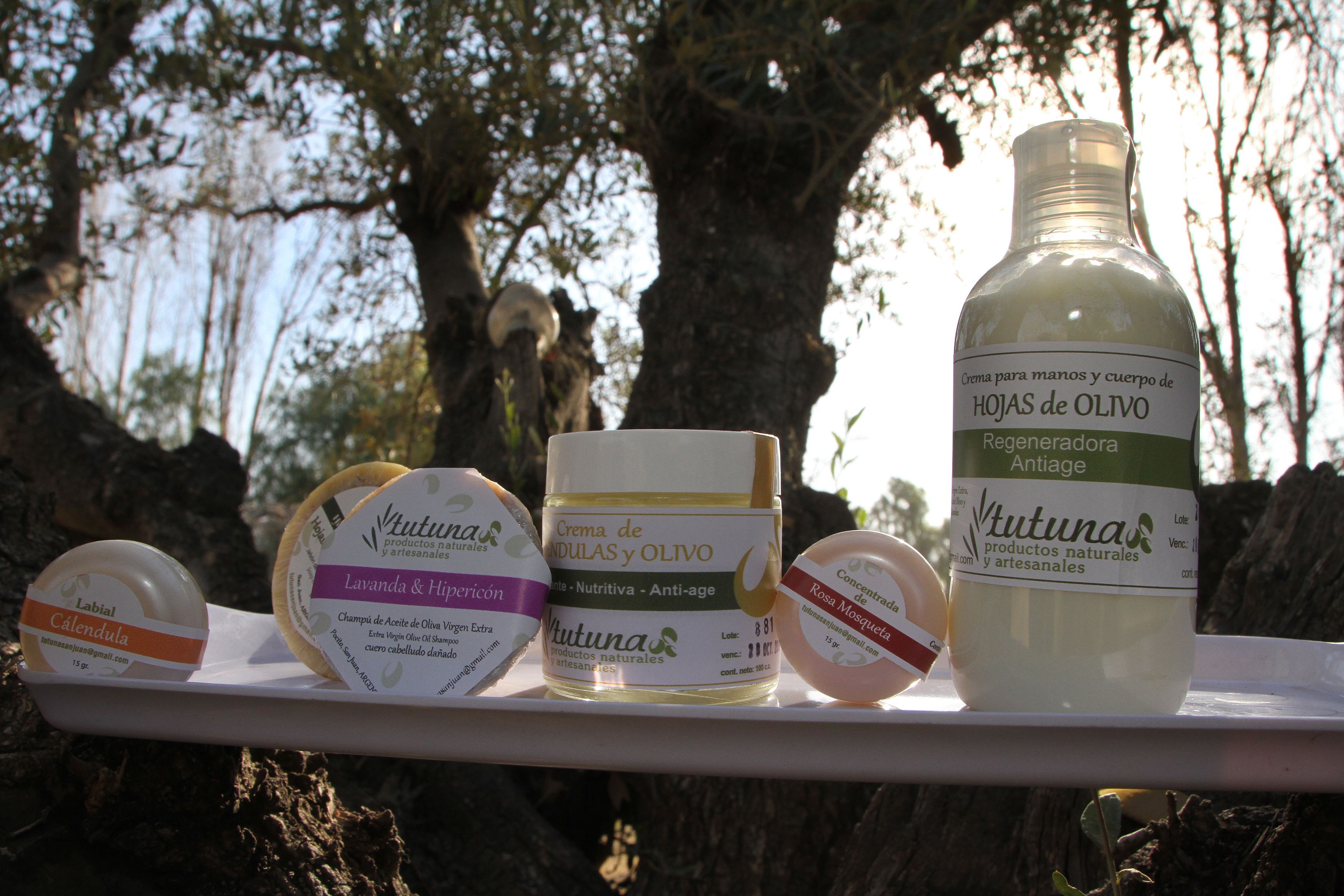 Aunque el Aceite de Oliva ha sido usado históricamente como bálsamo, tonificante, hidratante y reparador de la piel, las cutículas y el cabello, es en la época más reciente cuando ha emergido la cosmética con aceite de oliva como ingrediente destacado. Esto es debido al creciente interés que este ha suscitado entre la comunidad científica y la concientización de la producción sin contaminantes químicos. De este modo, hoy Gisella Villareal, es quien se encarga de hacer la parte de cosmética ecológica elaborada a base de aceite de oliva virgen extra. Comenzó hace 30 años, pero recién en el 2013 se animó a sacarlos a la venta. En la finca posee plantaciones de hierbas aromáticas para la elaboración de sus productos y otros son traídos del sur del país, donde Gisella vivió y aprendió del oficio. Cuenta que viaja seguido al sur a traer algunas materias primas para su trabajo, que viene de una tradición familiar el utilizar hierbas y buscar la salud por ese lado. Los aceites esenciales extraídos con alambique son la base de toda su fabricación y los llevan mucho para fitoterapia y terapias saludables. La finca Tutuna fabrica los siguientes productos: