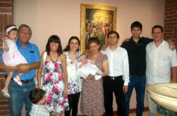 FOTO 1: Guillermo Coria, Andrea con su hija, Giuliana, sus abuelos Mirtha Segovia y esposo, Fernando Coria. Adelante se ubicaron los hermanitos de la bautizada, Sofía y Guillermo.