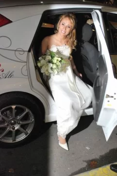 La boda fue en la basílica de Nuestra Señora de los Desamparados a la que llegaron en un automóvil "tuneado" con los rostros de ambos en sus puertas. La novia estuvo precedida por un cortejo de sobrinitos: María Emilia Noguera (4), Malvina Ares (3) y Camila Bermúdez (2).