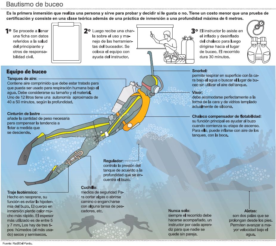 Sólo se trata de disfrutar, de encontrar el ritmo respiratorio con el equipo necesario para estos casos (Ver infografía), colocarse el tanque de oxígeno, toda una experiencia única que dura aproximadamente una hora (media de charla previa y llenado de fichas y media hora bajo el agua).