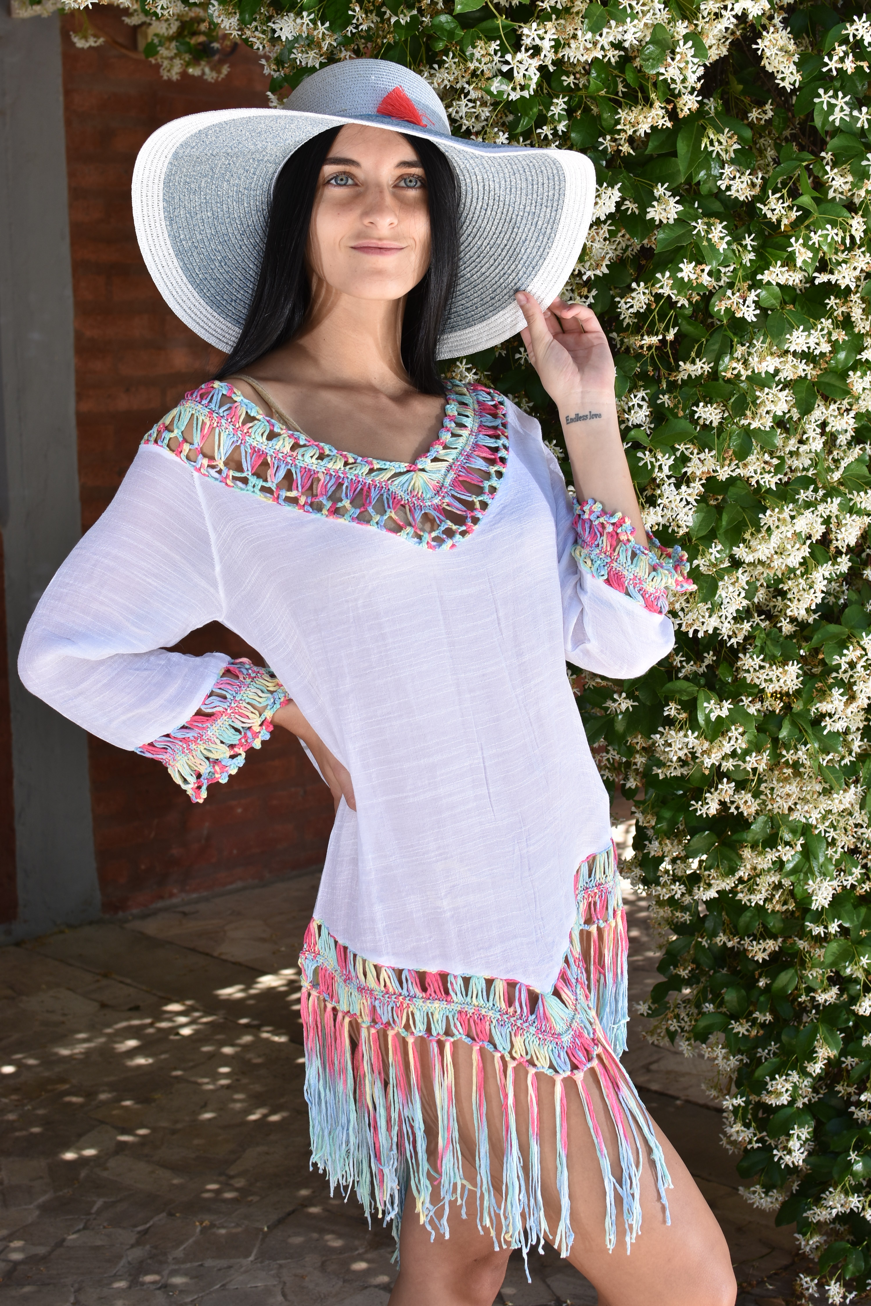Vestido con bordado crochet y flecos, $1.290 Capelina, $690