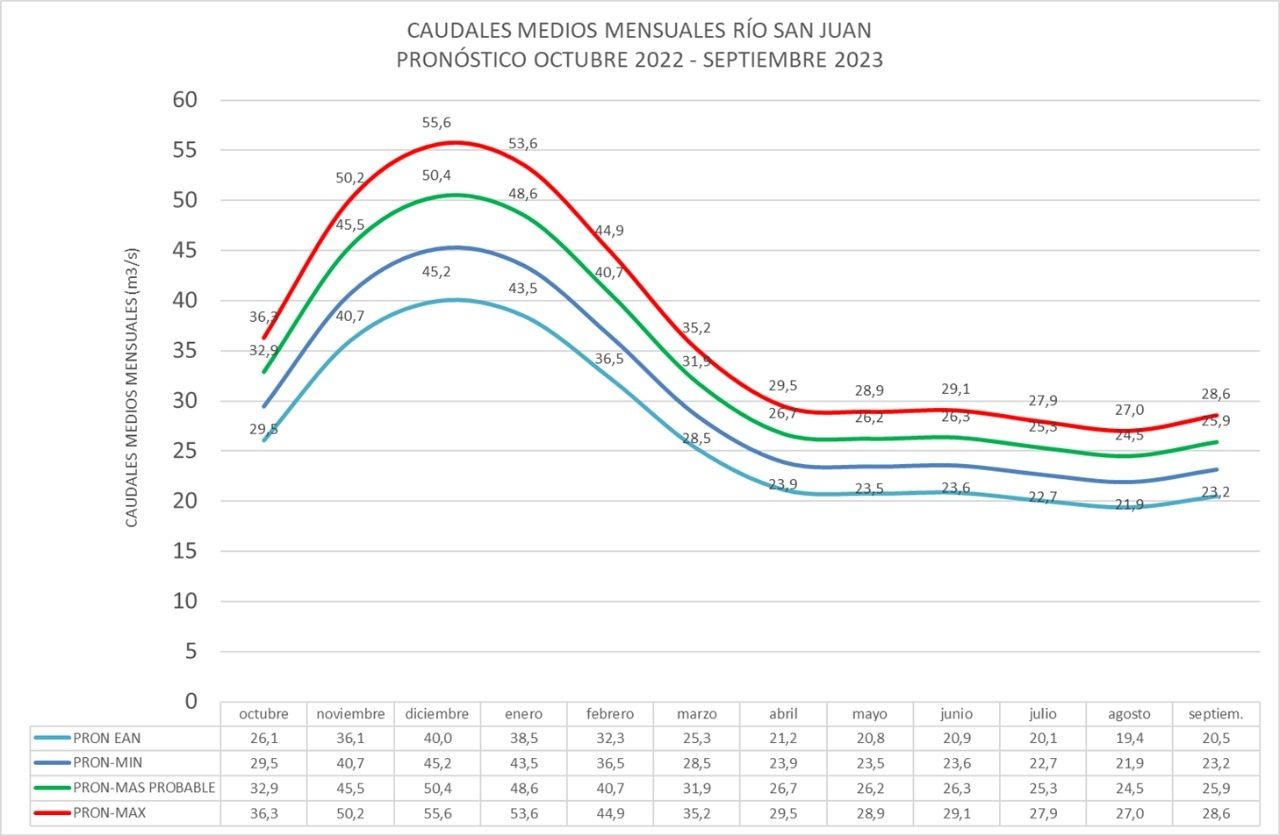 Ahora, "el Río San Juan si mantiene la tendencia en baja, se estaría acercando a la curva inferior celeste y la previsión, excepto alguna lluvia esporádica de verano; es que se mantenga en esa línea inferior. Las lluvias de febrero y marzo pueden hacer que suba algo el rio, pero dentro de estas bandas".