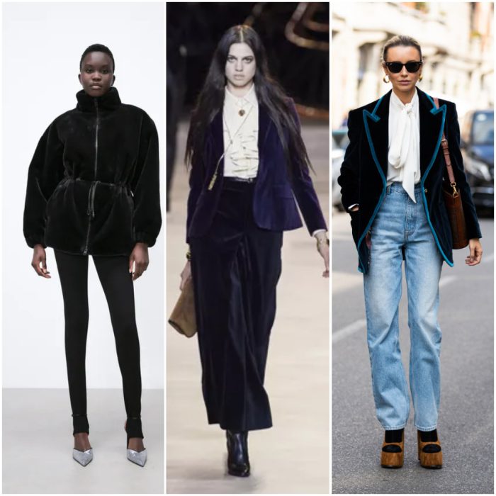 Este tejido suave y de ensueño es una fuente inagotable de inspiración invernal y un clásico indiscutible. El terciopelo conquistó las pasarelas con tomas infinitamente glamorosas. La tela se usó como un giro en los pequeños vestidos negros, pero también en otras siluetas holgadas con prendas lujosas y tan cómoda como la ropa de estar por casa.