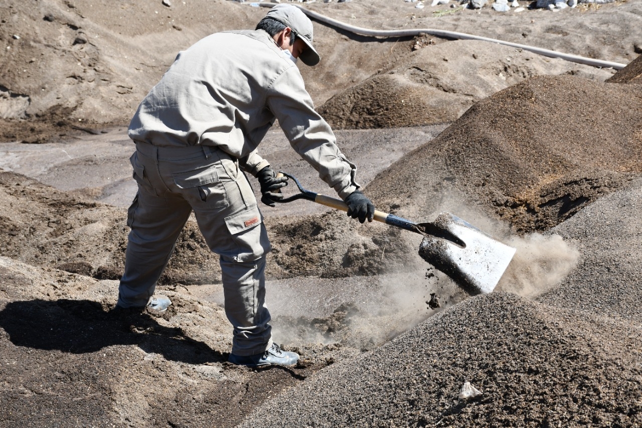 Continuaron "también el alperujo es otro material que proviene del sector privado y que necesita ser estacionado antes de su uso. El proceso inicia con el establecimiento de una fórmula en la que se incluye los parámetros carbono 70%-nitrógeno 30% para el correcto armado del camellón. Una vez logrado esto, comienza la fermentación, para esto se necesita un mínimo de un 40% a 50% de humedad que es provista por el sistema de riego por goteo".