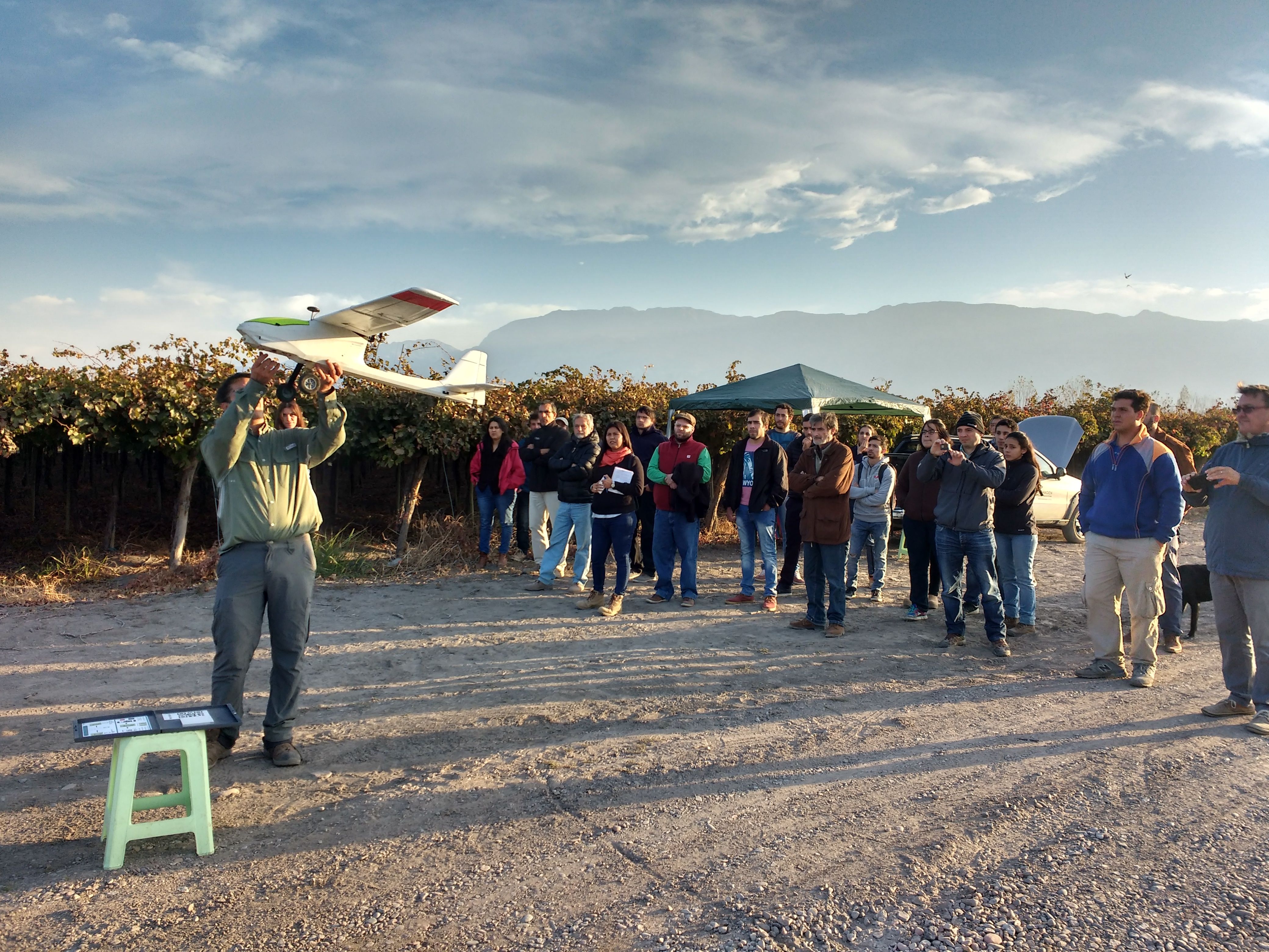 En la jornada de drones en el agro, al inicio los profesionales Mauro Cippitelli y Sergio Beltracchini del Centro de Ingenieros Agrónomos de San Juan informaron a los presentes los objetivos o lineamientos en los que se está trabajando en la actualidad. Uno de ellos es la tecnificación permanente y por ello entra lo de las actividades con drones y alta tecnología en cultivos locales. También se trató la importancia de las incumbencias profesionales de este rubro de la ciencia y los planes a futuro que posee la comisión directiva actual de la entidad. Luego el técnico electrónico José Debanne, de SupraImagen, explicó sobre la planificación de un vuelo autónomo y hubo salida al exterior, con la demostración de vuelos de avión y también de un cuadricóptero. Analía Díaz, también de la misma empresa, se explayó sobre introducción a los mapeos, relación con la fotosíntesis de las plantas e índices de vegetación más utilizados. También habló sobre los momentos oportunos para confeccionar los mapas y casos más exitosos en vegetales comunes en San Juan. Se mostraron mapas de cultivos relevados a campo y se analizó con los asistentes.