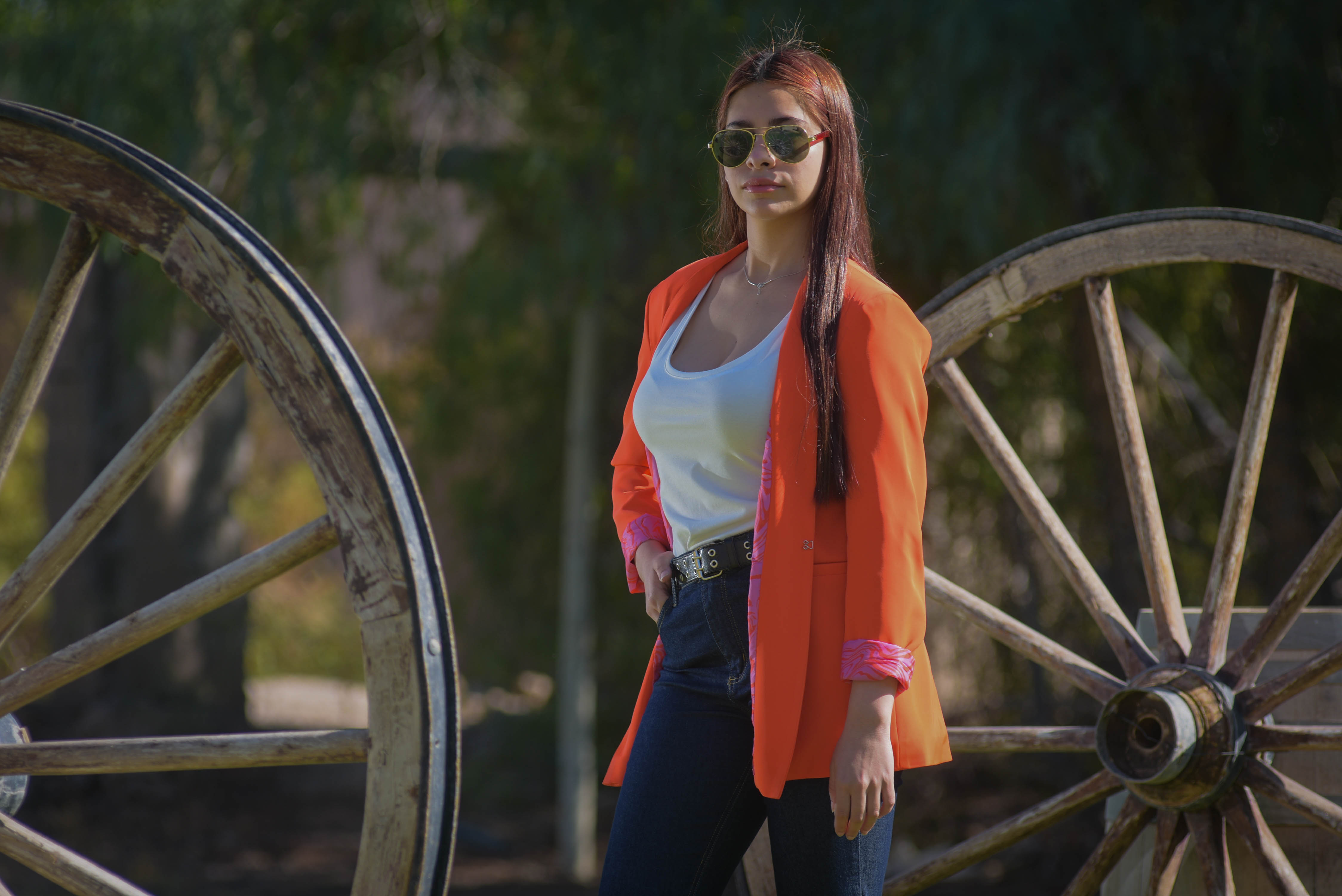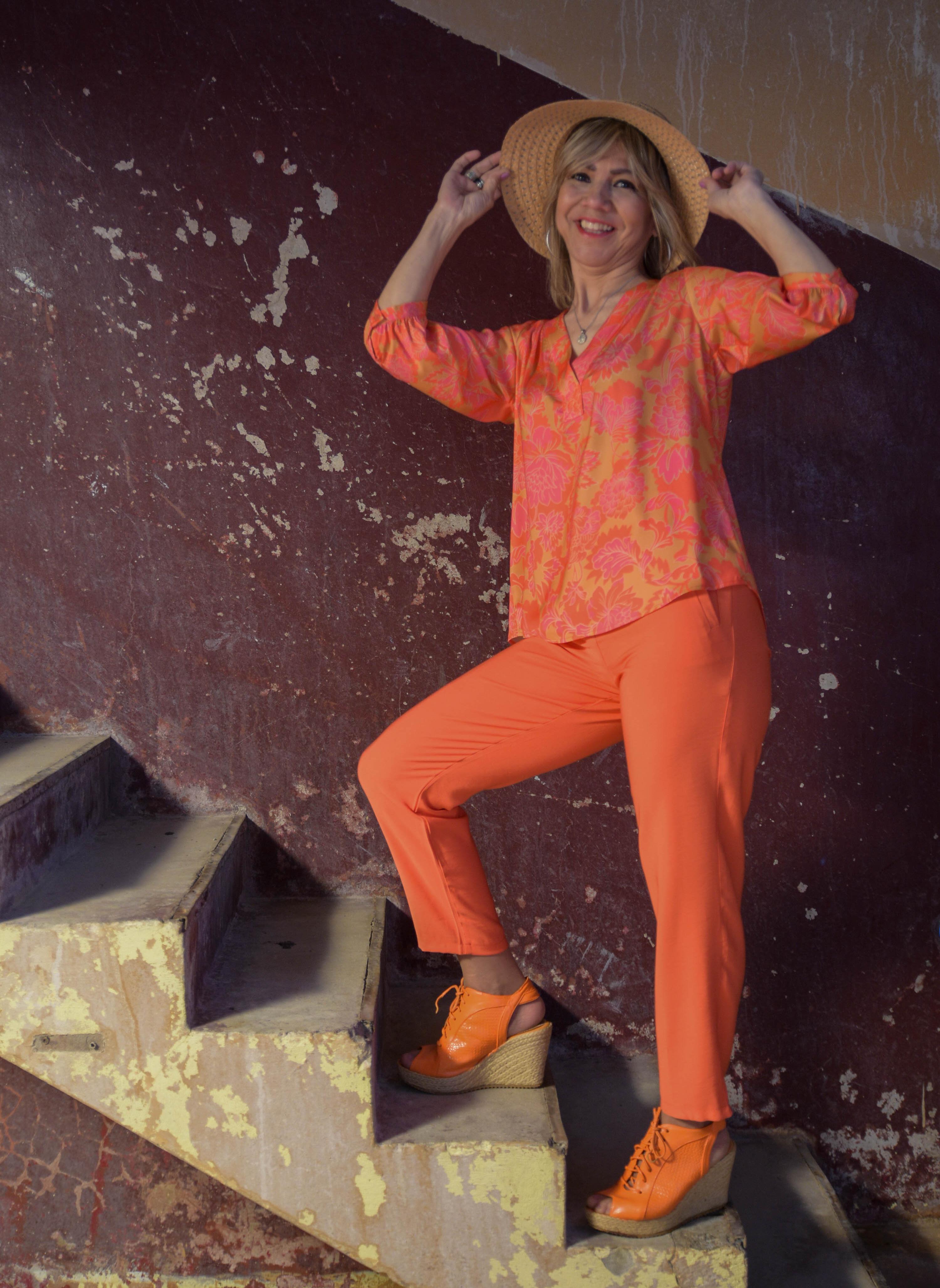 Jean capri ($14900) con musculosa de algodón ($5990) y blazer naranja forrado en su interior, entallado al cuerpo y sin solapa ($32950).