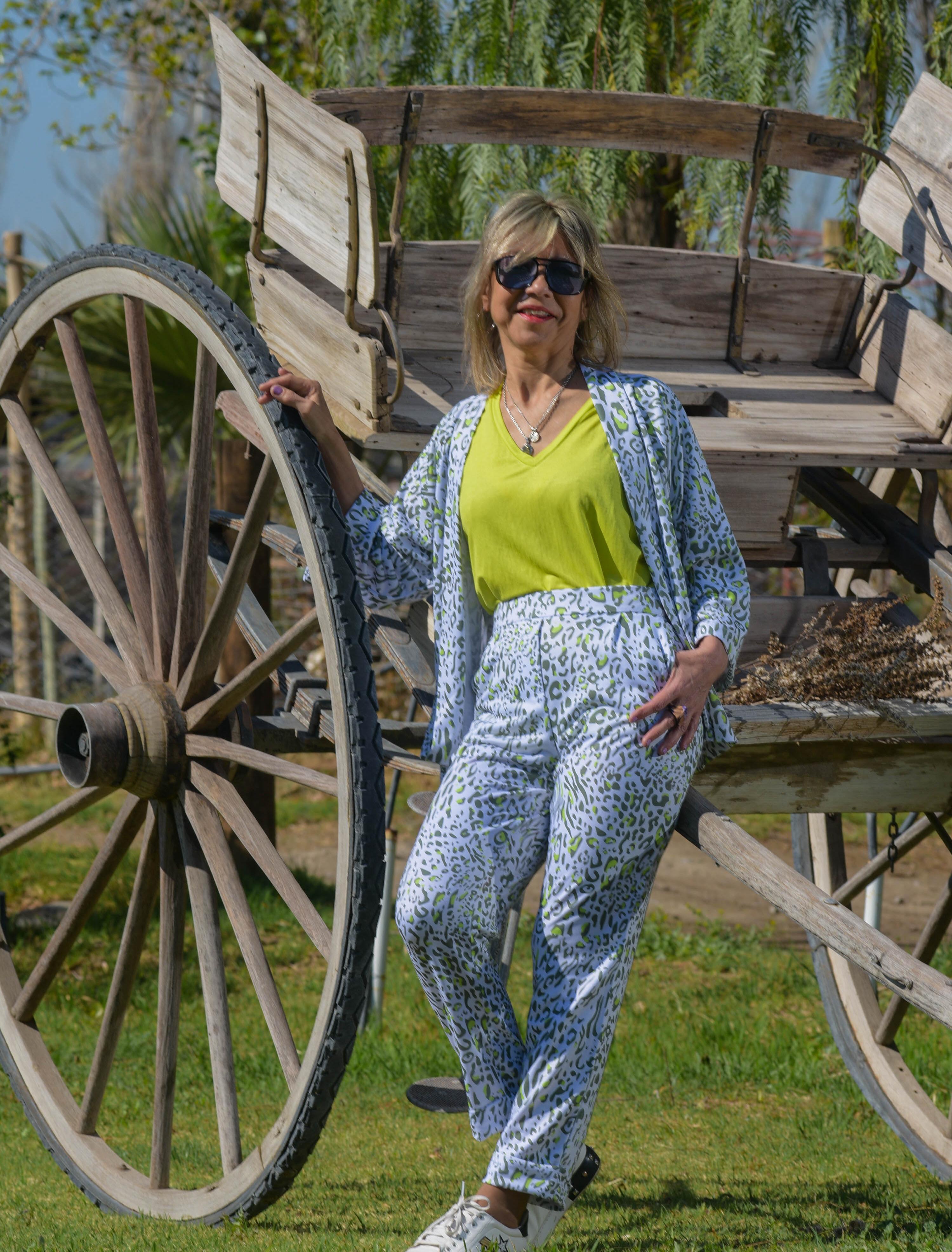 El animal print se ha modernizado, buscando nuevas estampas y colores, como en este caso que Mónica presenta un pantalón de algodón tramado ($14950) con kimono estampado de algodón de seda ($9990) y remera verde manzana, a tono con el resto del equipo ($9990).
