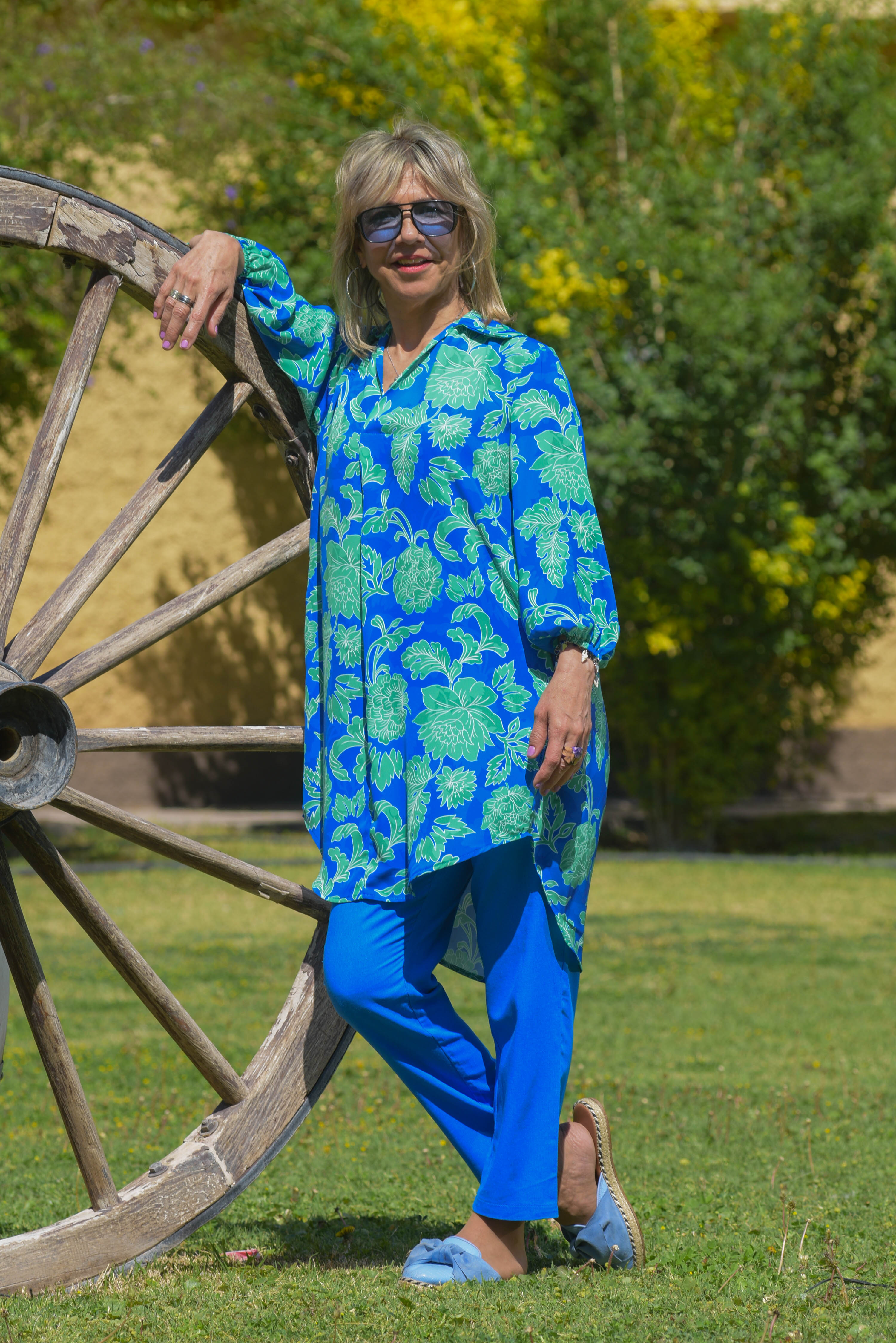 Vestido de seda estampado que también puede hacer las veces de camisola ($27990) con pantalón en tono azul ($15950).