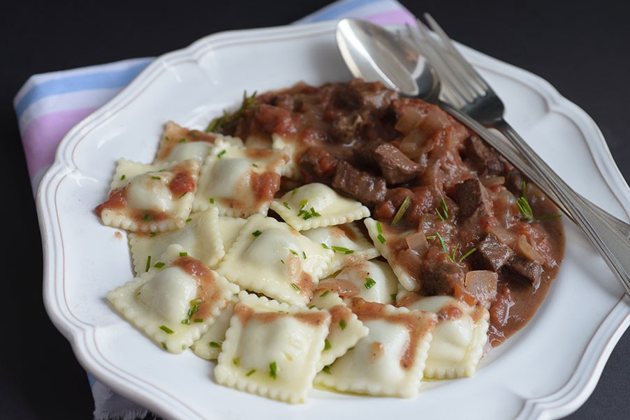Pasado ese tiempo se estira a bolillo y se deja a dos milímetros. Cortar en cuadraditos, que es la forma del raviol, y colocar el relleno en el centro para cubrir luego con otra parte de masa. Se aprietan los bordes y se hierve de 10 a 12 minutos.