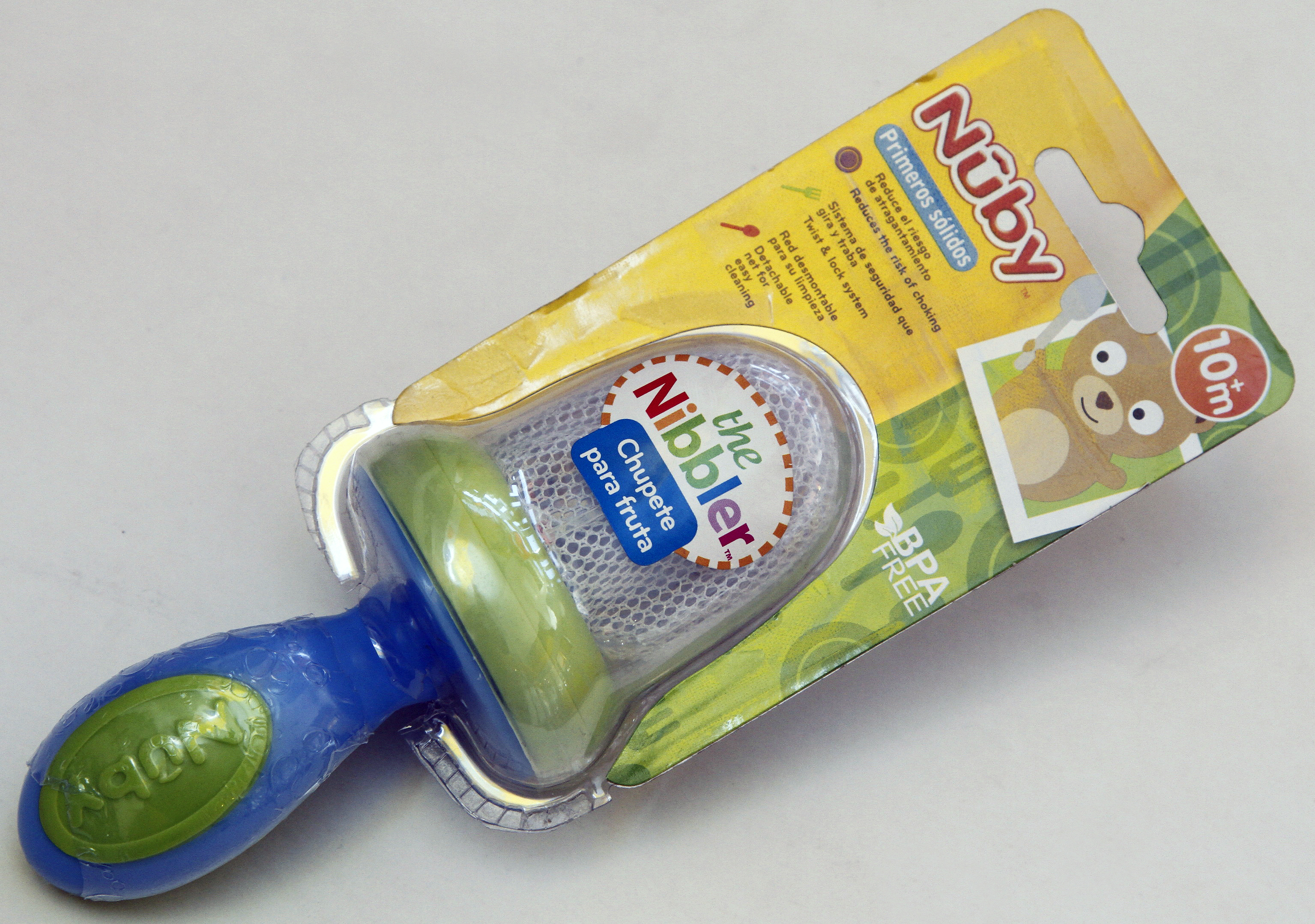 Contiene un sujetador atóxico y un dispositivo de tul también atóxico, lavable y desmontable donde se coloca la fruta o la verdura. Esta red evita el riesgo de atragantamientos y permite ingerir las propiedades de los alimentos ($195, Nuby).