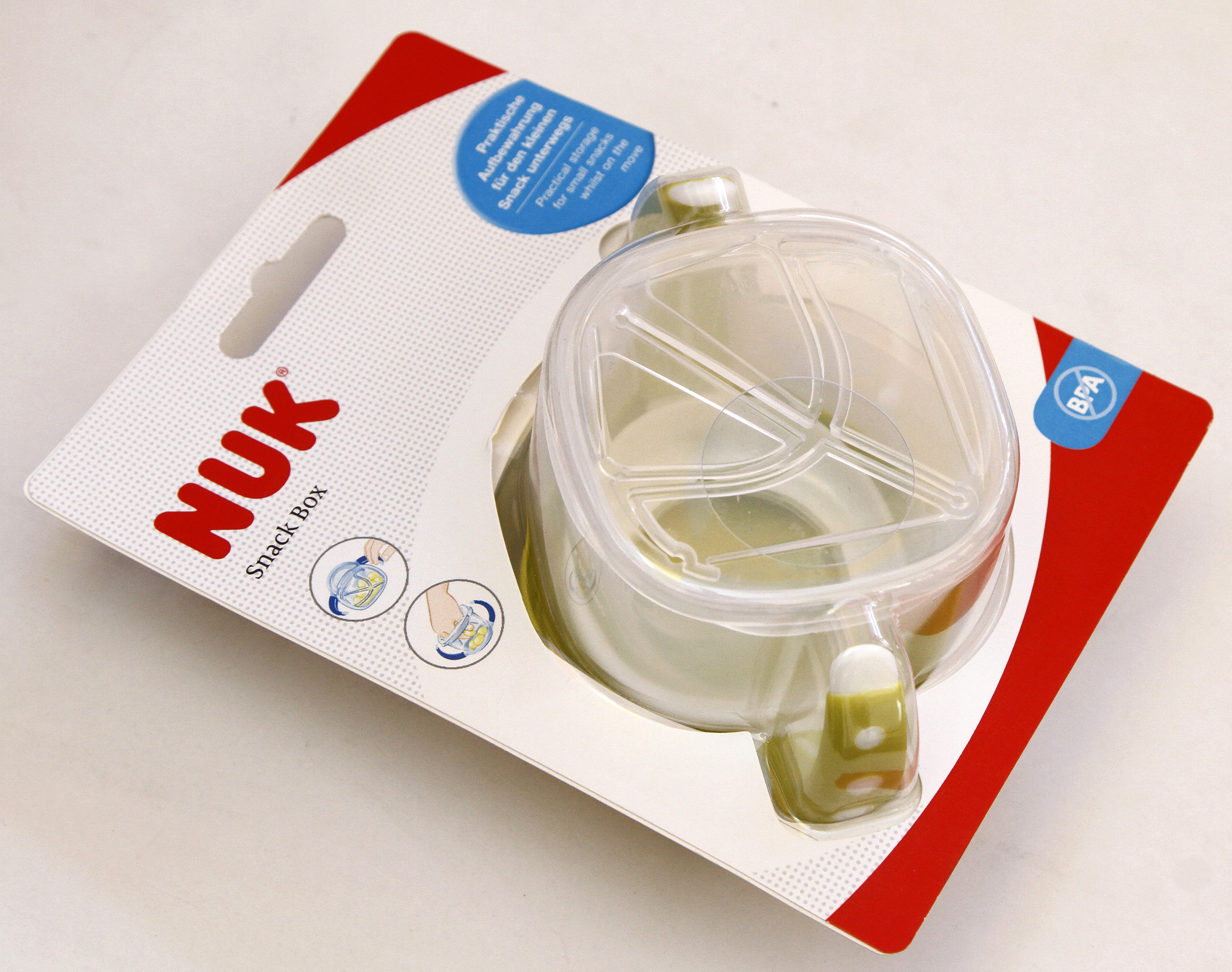 Recipiente con sistema antiderrame. Posee una tapa extraible de silicona atóxica, que a través de ranuras específicamente diseñadas permite que el niño extraiga los cereales, pero no pueda derramarlos. ($245, Nuk).