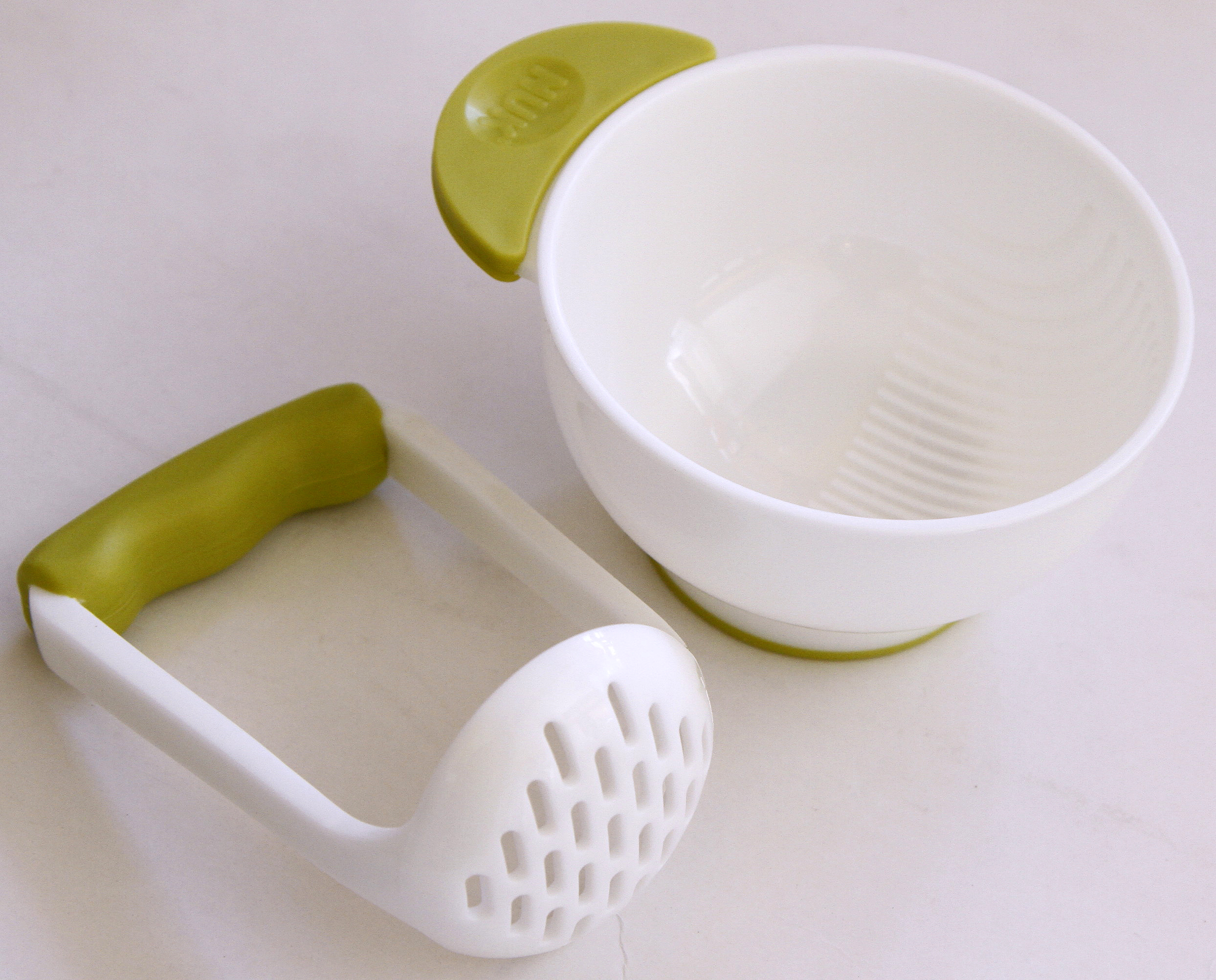 Es un set con un pisa verdura adaptado, para preparar y servir papillas y purés perfectamente disueltos. El plástico puede calentarse en microondas y posee una manija antideslizante para sujetarlo ($335, Nuk).