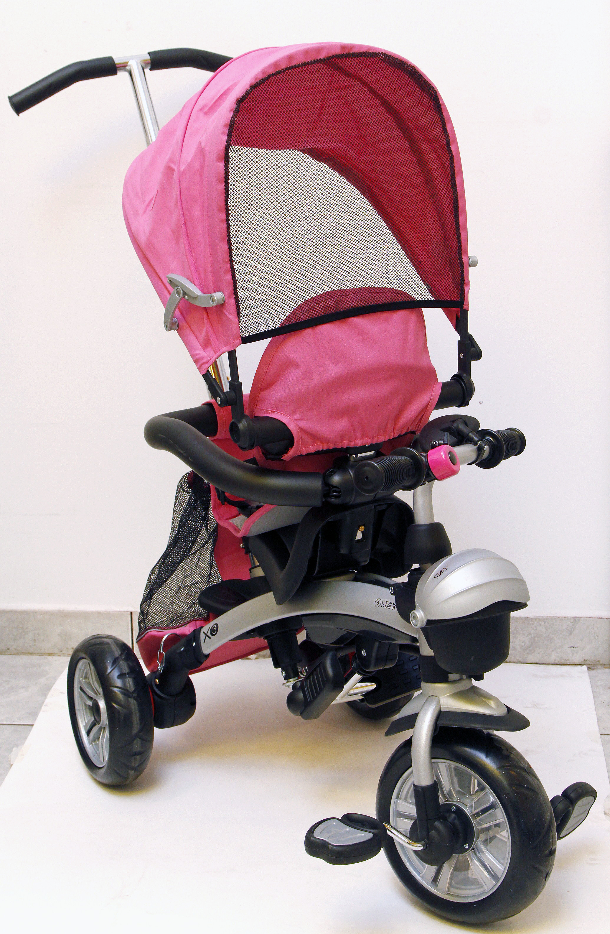 Coche – triciclo y bicicleta, para niños desde los 4 meses. Posee techo corredizo, bocina, cuadro de aluminio, asiento giratorio 360 grados con reductor con sistema ajustable de hebilla, espejo, manija regulable, bolso contenedor y baranda acolchada removible ($3.685, Stark).