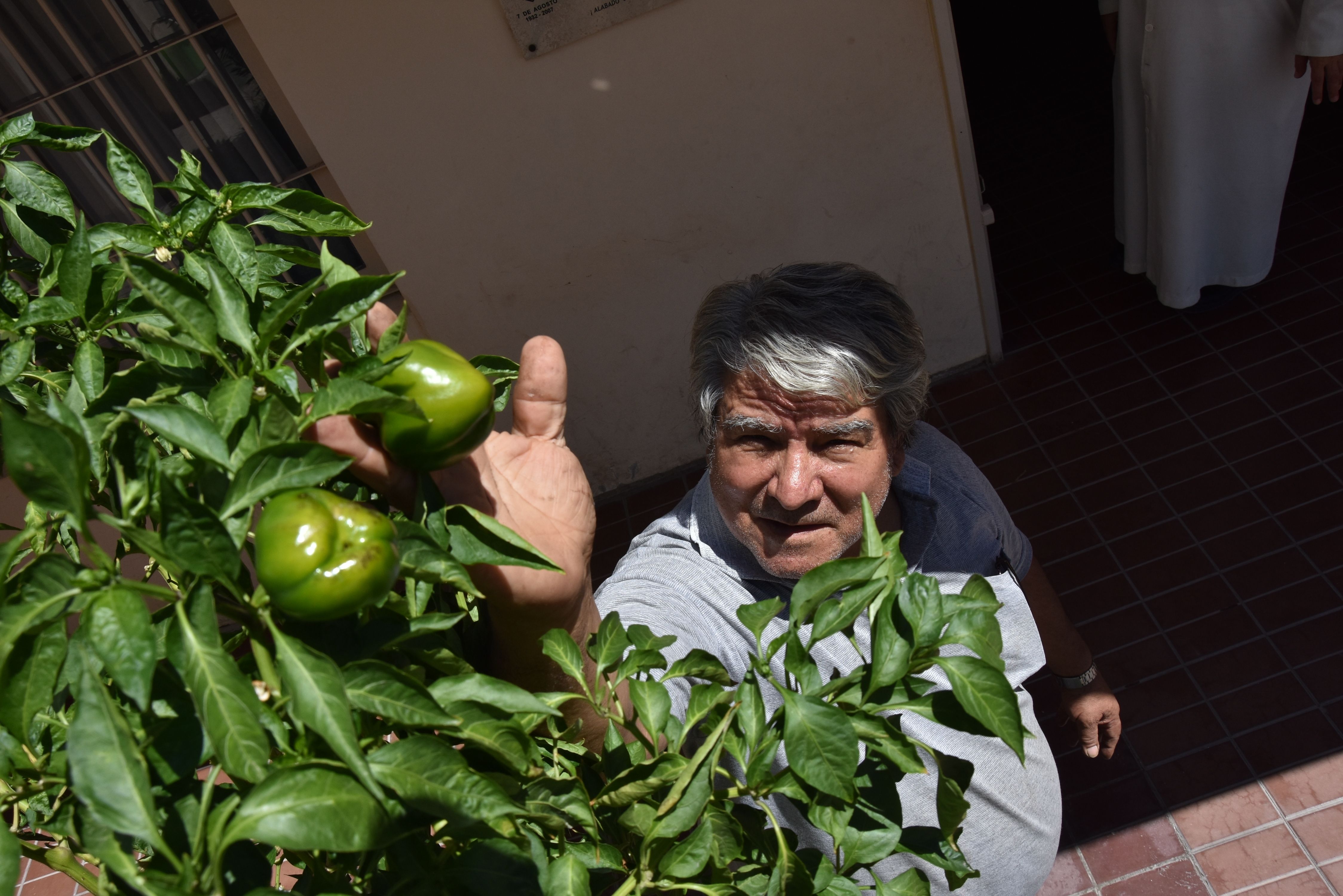 El padre Orlando Ruggeri, párroco de la Santísima Trinidad, cultiva en los canteros de su parroquia y de la casa parroquial algunas hortalizas entre las que se destacan unas plantas de pimiento -Capsicum annuum- de unos tres años de vida que +ya superan los dos metros de altura y sorprende a los feligreses por la cantidad de frutos que nos regala+. Si bien es una planta herbácea, al reparo de las heladas, con adecuados cuidados, alcanza buenos rindes y se transforma en una planta de gran porte. En la foto un feligrés admira el fruto.