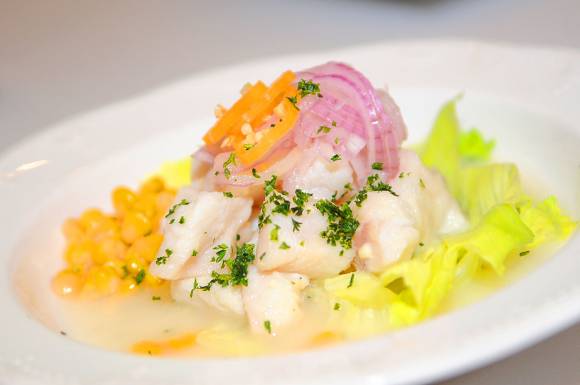 Ingredientes: 2 filetes de pescado de carne blanca (puede ser gatuzo o merluza en este caso), 2 cebollas moradas, cilantro o perejil picado a gusto, 100 gramos de tomatitos cherry, 1 choclo desgranado, 1/2 ají picante (picado bien fino), jugo de 5 limones (en la receta original se utilizan limas), 1/2 planta de lechuga, 2 papas, sal a gusto.