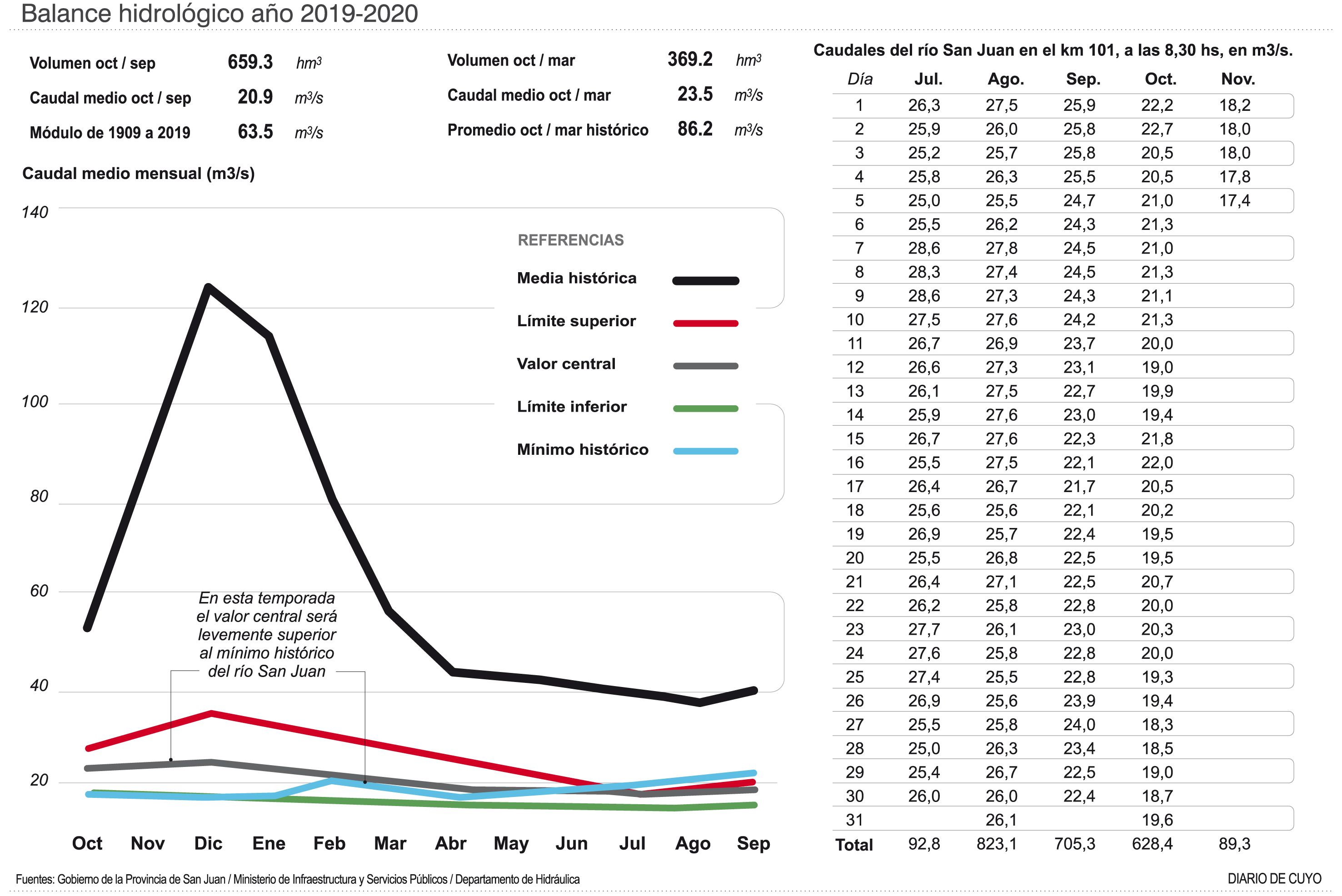 El volumen de caudal del río San Juan, desde octubre y hasta marzo, llega a 369 hectómetros cúbicos por segundo, en la tradicional Estación de Aforo de Zonda, ubicada sobre el kilómetro 101. Y en el período octubre a septiembre, llega a los 659 hectómetros cúbicos que mencionamos más arriba. Cifras alarmantes.