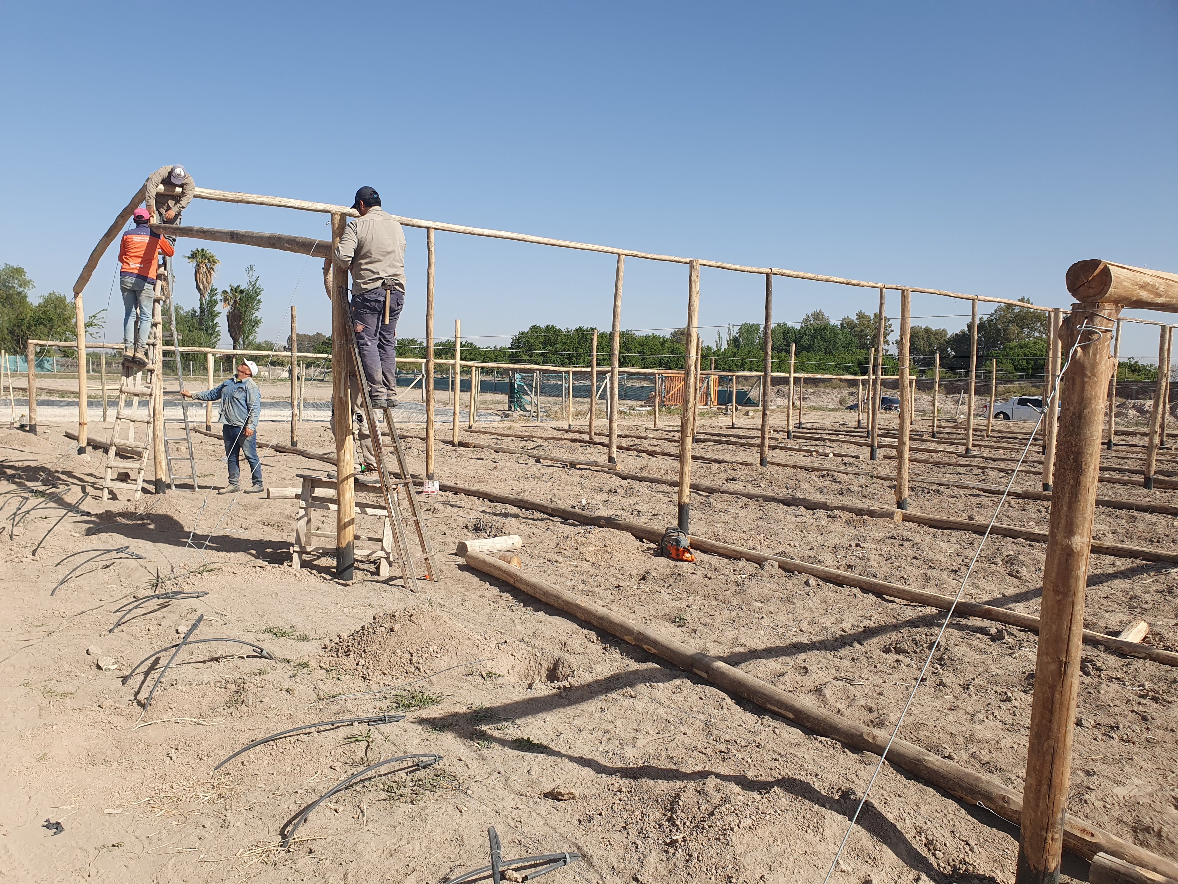 Al salir de la nave con gran movimiento de gente para cosechar el pimiento verde, nos encontramos con una cuadrilla armando otro invernadero nuevo, totalmente de cero. Este proyecto, que ya está pasando a la realidad, es de 1.800 metros cuadrados. Y finalmente la intención de los Ramis es llegar a 5.000 metros cuadrados de naves con cobertura plástica para producir diferentes hortalizas para el mercado interno.