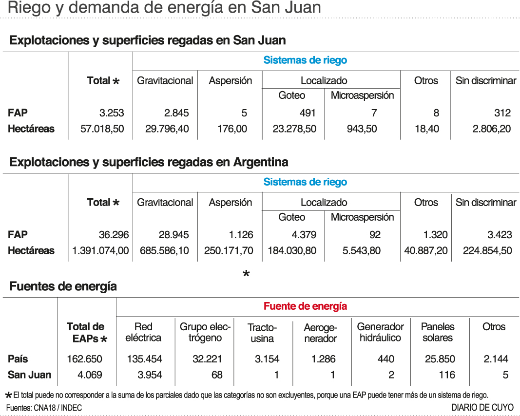 En el país la cifra de EAPs con riego es 10 veces mayor: 36.246. Aunque el número de empresas que han incorporado al menos algún sistema de riego además del gravitacional, es apenas un 3% mayor al número sanjuanino, es decir, el 19%. 1.391.074 es el total de hectáreas irrigadas con algún sistema incluyendo las 686 mil de riego a manto o por bordos.