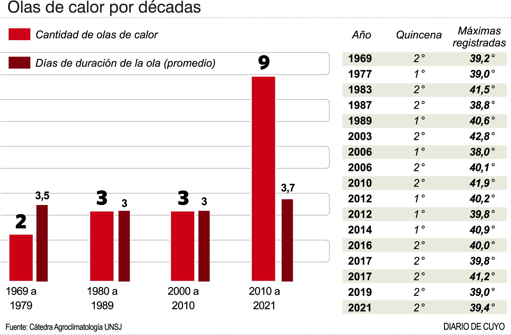 El estudio desarrollado con la información estadística procesada por el ingeniero Cristian Albors y sus colegas investigadores, entre sus resultados "obtuvo como temperatura de corte para el mes de enero en el departamento de Pocito de 37.9 °C. Por lo tanto, se identificaron un total de 17 Olas de Calor -OC- en toda la serie°. En la infografía puede observarse °su distribución por décadas. Se destaca el mayor valor alcanzado, 9 OC, para los años comprendidos entre el año "10 y el "21. También podemos decir que hubo años que registraron 2 OC -años "06, "12, 17- y que la quincena del año que más acumuló estos eventos fue la segunda, con un total de 11".