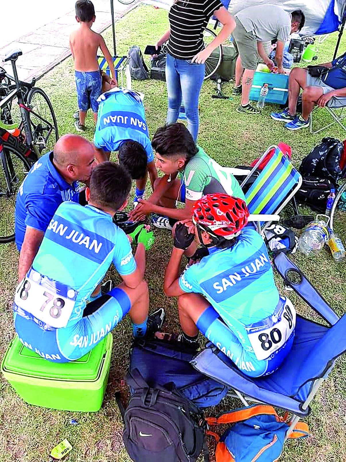 Desde pequeños mis hijos se criaron con bicis y yo trabajo como bicicletero, vale decir que a ellos les pasó un poco como a mí, digo mi historia, todo giraba en este mundo. Rubén, es Campeón Argentino de ciclismo, tiene muchos títulos de ruta de mayores, de pista y otros más. Duilio es campeón de sub 23 de ruta, tiene varios títulos y hoy vive en España. Andrés, acompaña a los hermanos y los masajea, porque se preparó en esto, anda en bici pero no compite. Juega en primera en futsal en Deportivo. Exequiel, el más chico, compite en ciclismo.