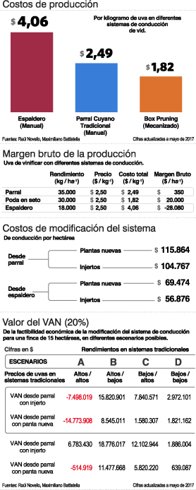A los fines de mostrar el impacto del sistema de conducción en la rentabilidad del viticultor, se realizó un análisis comparativo de proyectos de inversión a veinte años con sistemas parral cuyano (35.000 kg / ha), espaldero (18.000 Kg / ha) y poda en seto (30.000 kg / ha) este último con manejo mecanizado de poda y cosecha. Se supone en todos los casos que la uva se vende para vinificar. Para las estructuras tradicionales se consideró que todas las operaciones se realizan de forma manual.