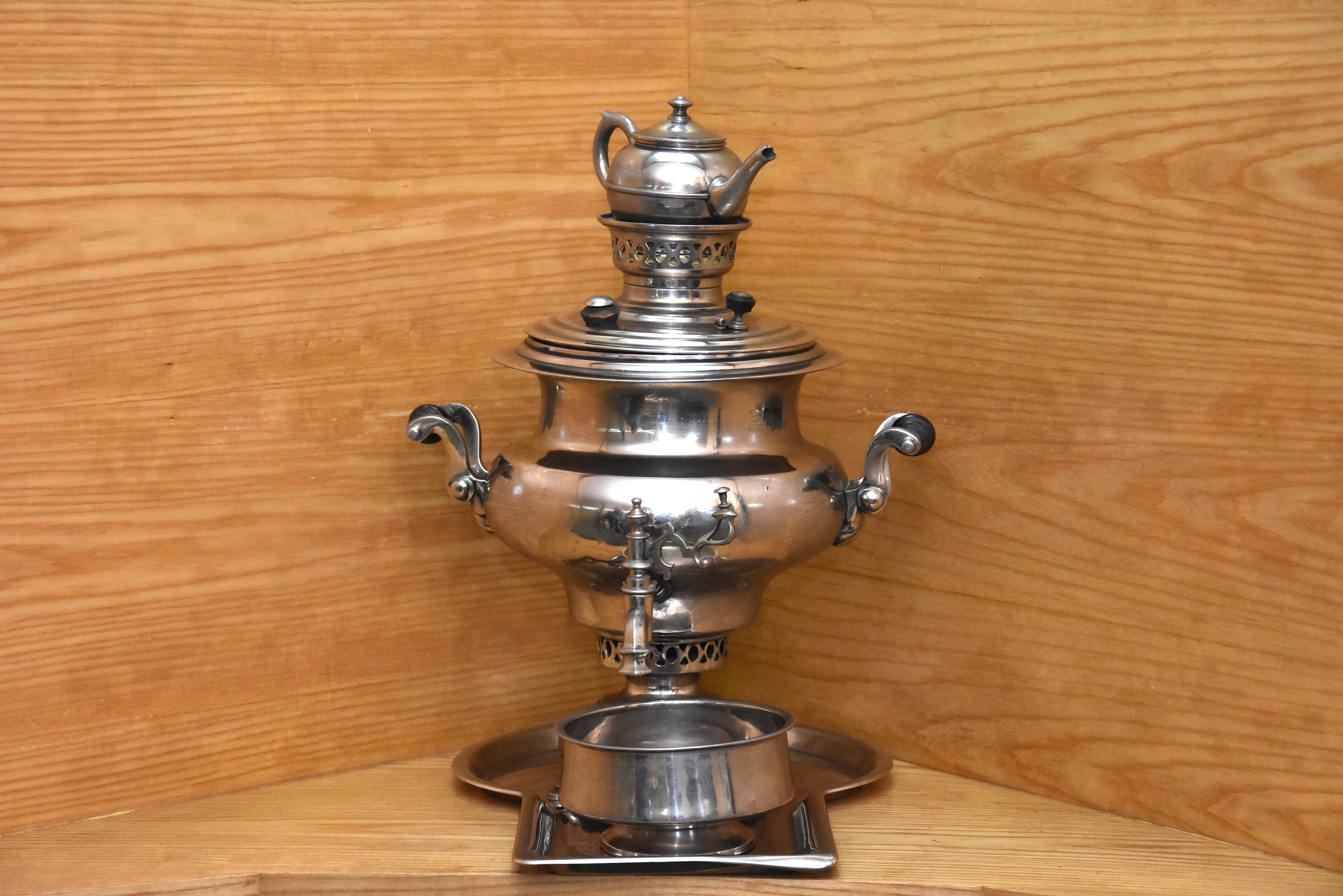 Este objeto de plata, un verdadero tesoro de familia, conserva todas sus piezas (la bandeja donde se apoya todo el artefacto, el recipiente donde caen las gotas, la tesera para servir, el espacio para colocar las brasas y así mantener el agua caliente por horas y horas) sólo una vez salió de la casa. Para una exposición de objetos típicamente judíos, días antes del atentado a la AMIA.