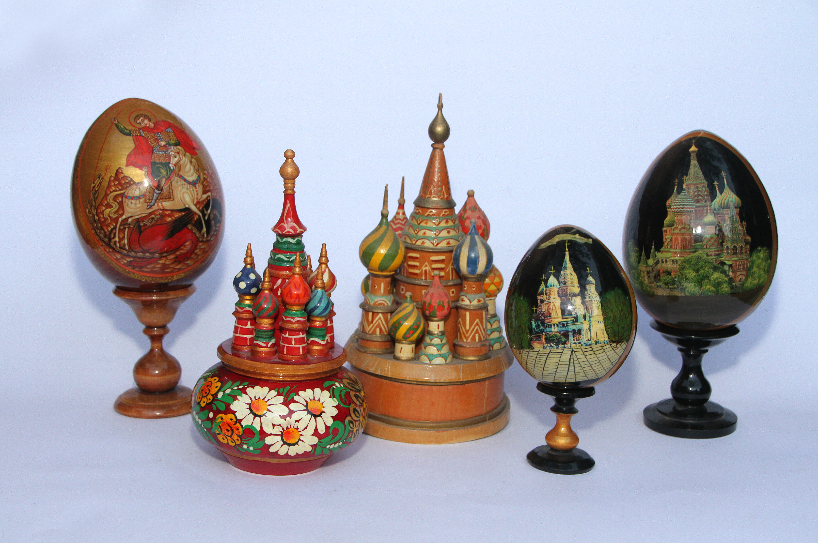 La Catedral de San Basilio es el icono de Moscú. Se ve en la televisión y en películas, en revistas de viaje o como imagen decorativa tallada en madera y pintada a mano. También los huevos de pascua en madera pintados a mano en representación de los famosos Huevos de Pascua de Fabergé.
