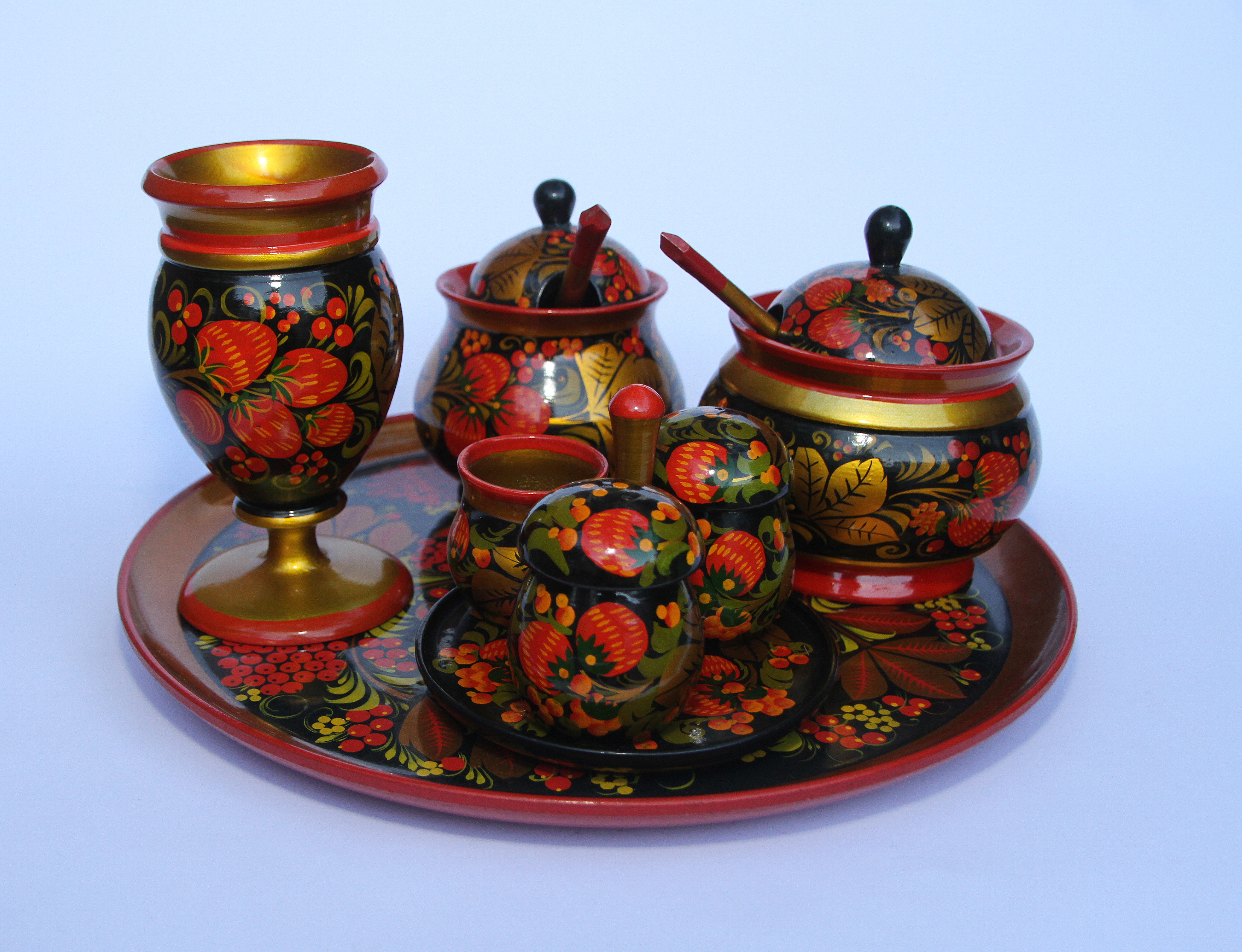 Khokhloma, este nombre es el estilo de pintura (colores vivos y dorados sobre fondo oscuro), que tienen diversos objetos como cucharas, platos y cuencos de madera, la pintura apareció por primera vez en la segunda mitad del siglo XVII en Nizhni Nóvgorod.