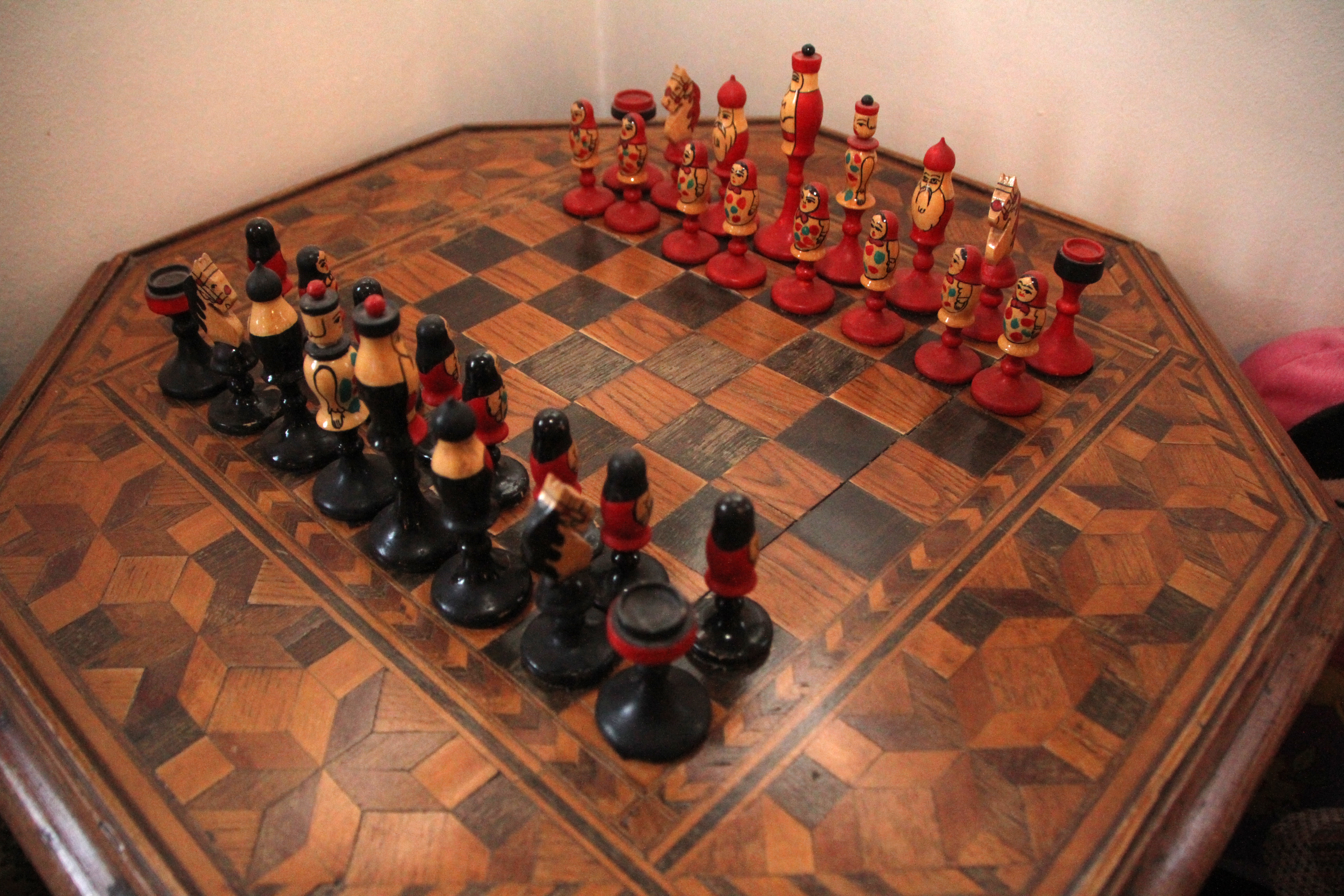 Ajedrez Ruso, un objeto artesanal con figuras de matrioshka, hecho a mano y pintado con detalle todas las figuras.