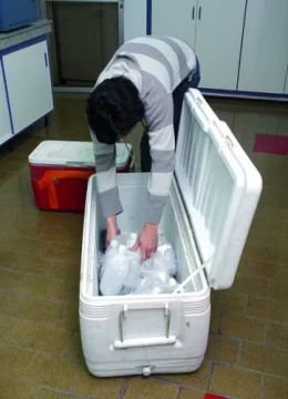 Llegan refrigeradas en una heladera. Se realiza control de temperatura, de PH y se corrobora que la cantidad de botellas descriptas en la cadena de custodia estén presentes en la heladera de transporte. La cadena de custodia indica la fecha de muestreo, qué tipo de muestra es y su preservación, entre otros ítems. En cada botella se busca una serie de elementos a investigar, como PH, conductividad, metales, cianuro metal, cianuro libre y otros.