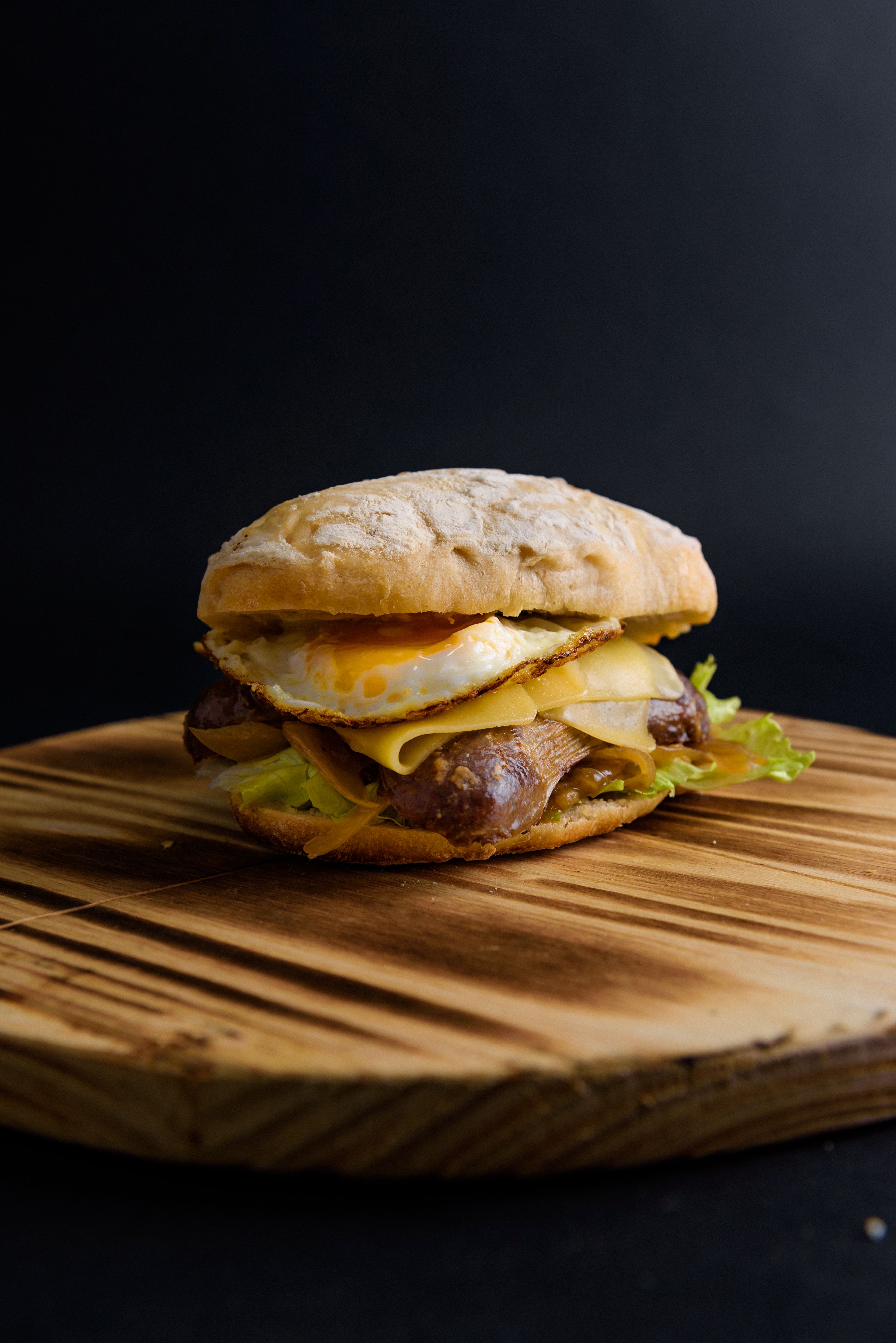 TERNERA AHUMADA.Chorizo artesanal de ternera, pan de masa madre, cebolla caramelizada, queso, lechuga y huevo frito.