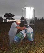 La trampa de luz es un dispositivo que cuenta con un tubo fluorescente que al encenderse atrae a las mariposas de hábito crepuscular y nocturno, una estructura con paletas en las que chocan, un embudo donde caen y un canasto que las colecta. ‘Se las extrae del recipiente, se las adormece y se registra cada especie recolectada en una planilla’, explicó Saluso.