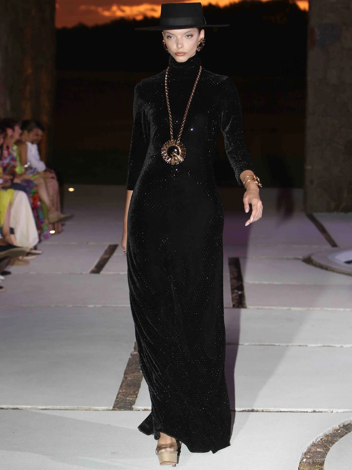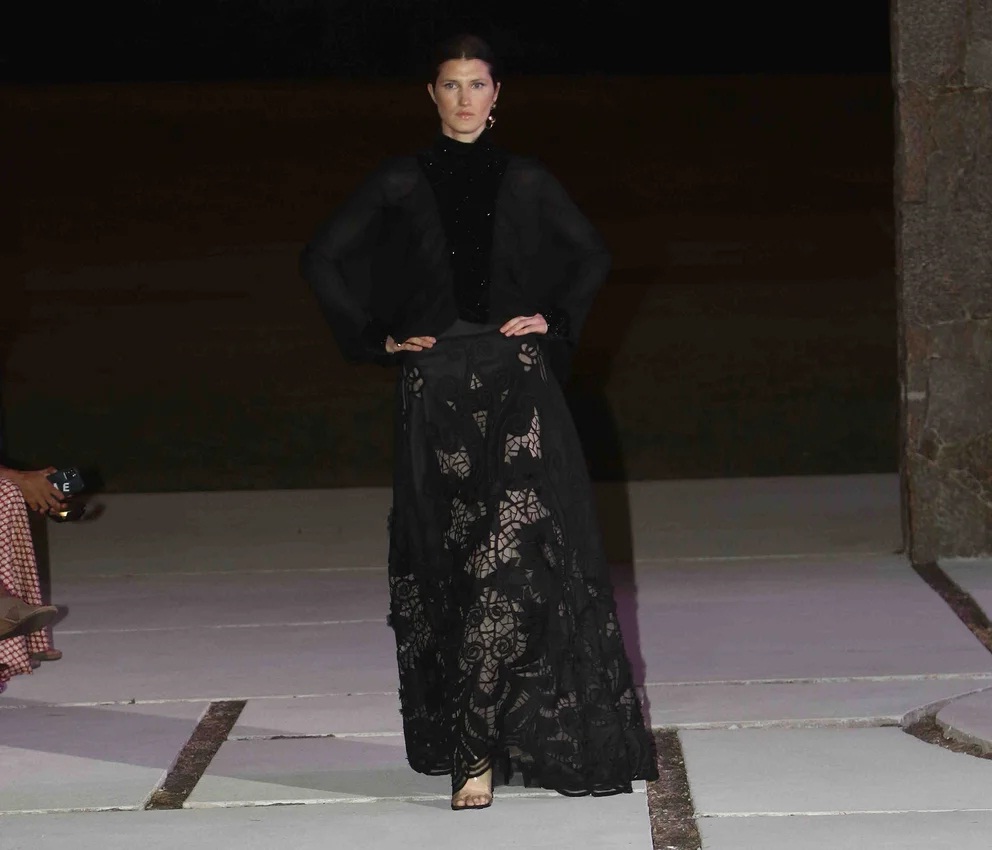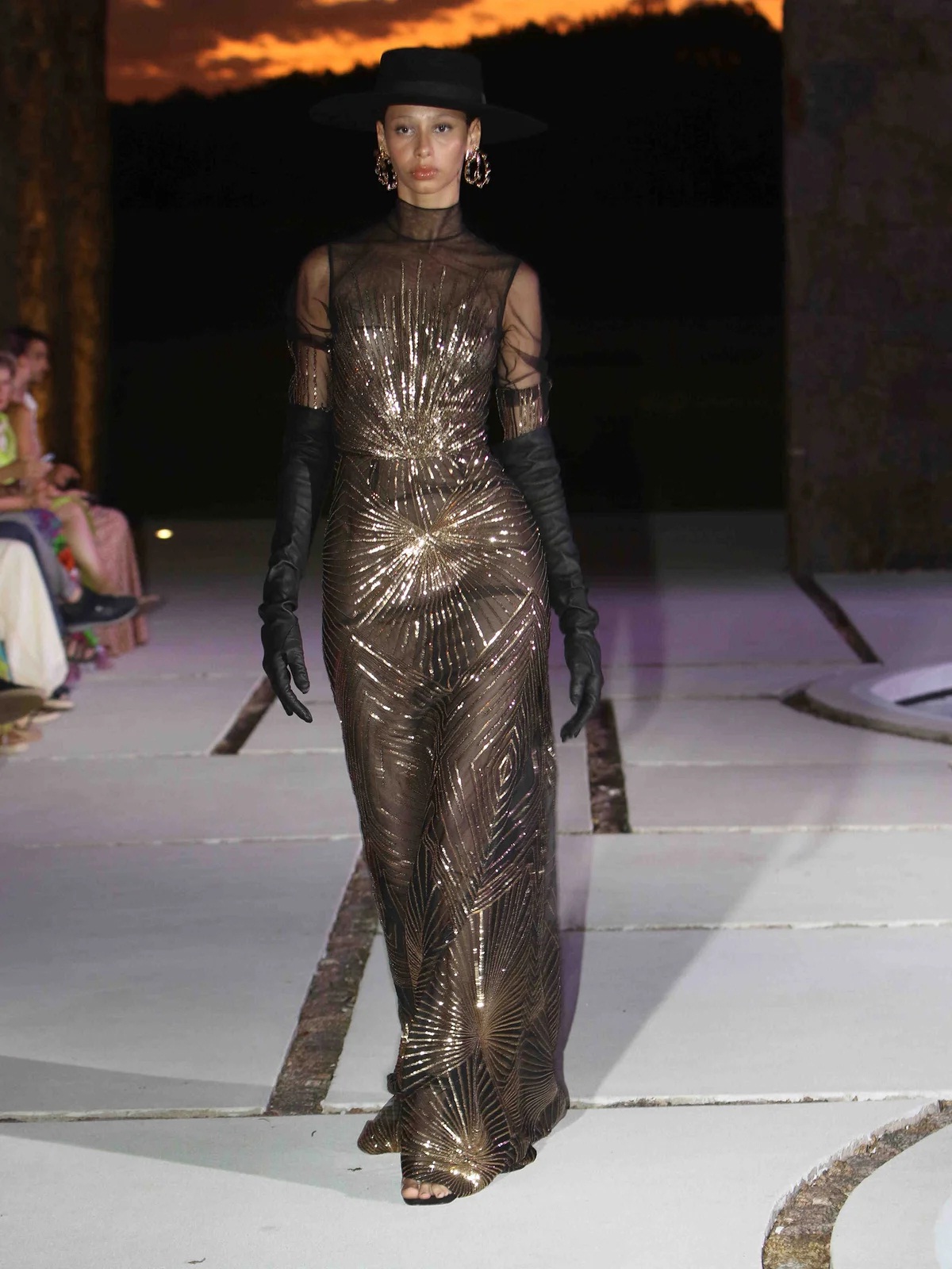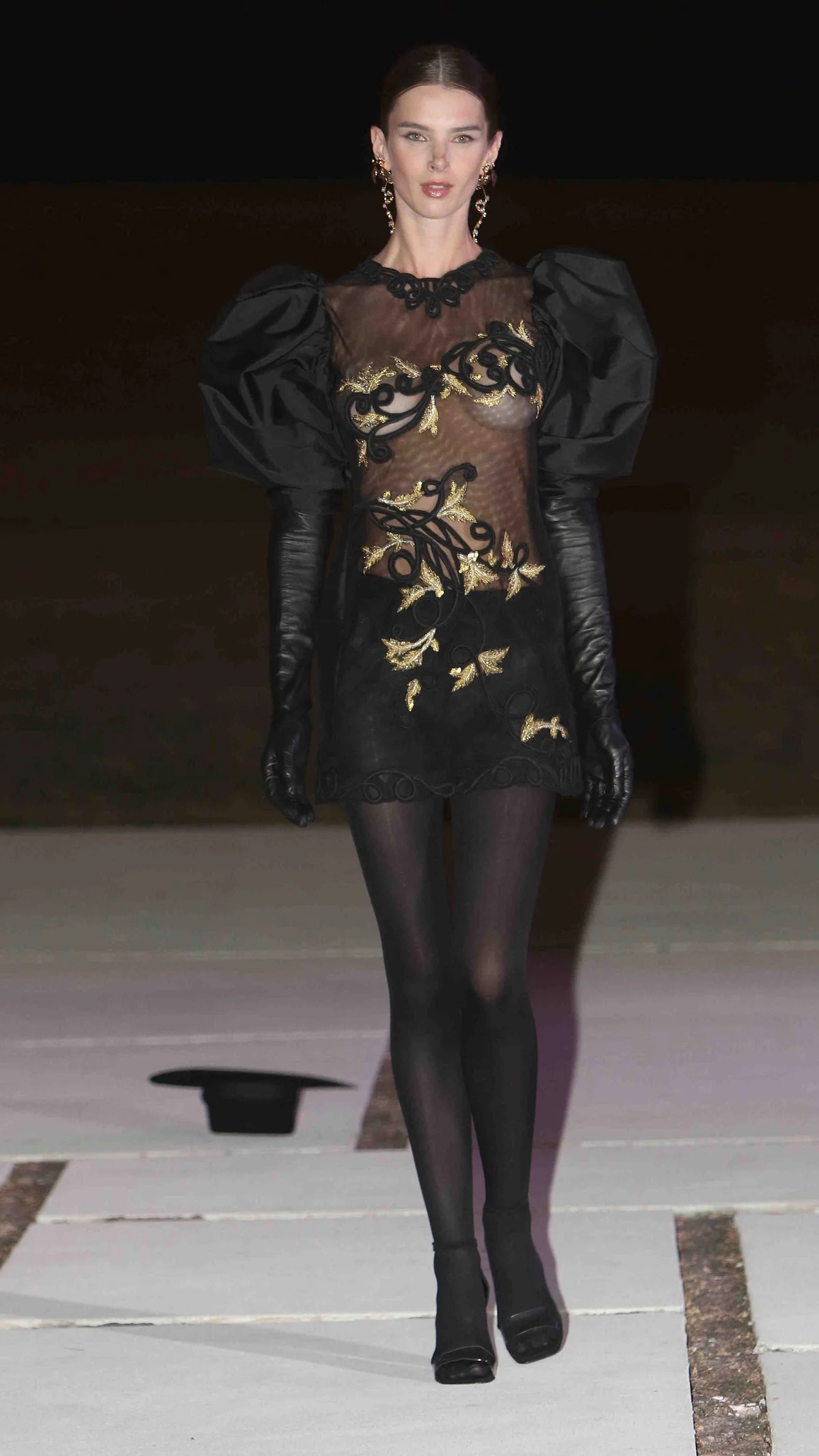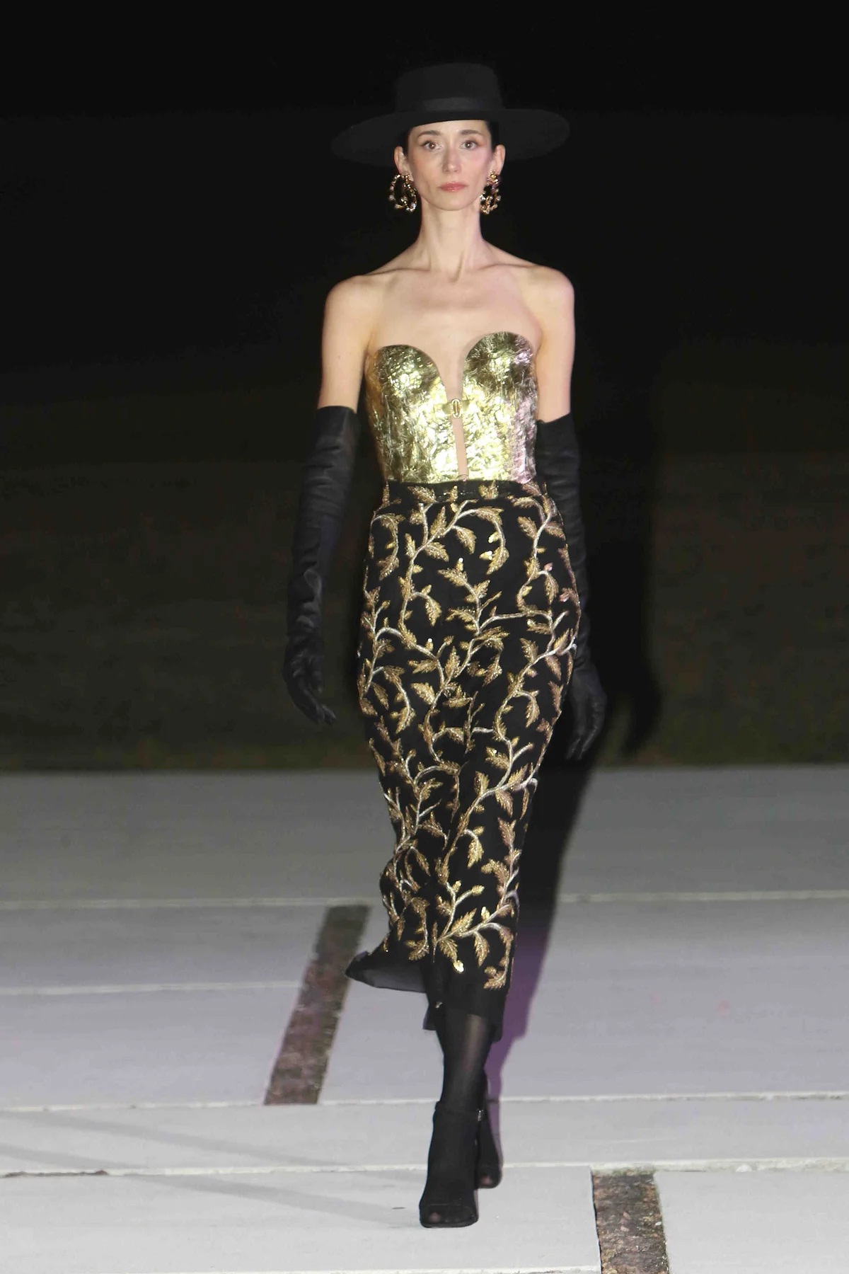 Las modelos lucieron elegantes trajes con brillos sutiles, tonos dorados y metalizados. Además, mostraron cómo el negro y el off white se combinan en accesorios y vestidos de diversas materialidades: textiles como el shantung, terciopelo, tul, seda, gasa y lana hicieron juego con líneas simples y mangas extralarge.
