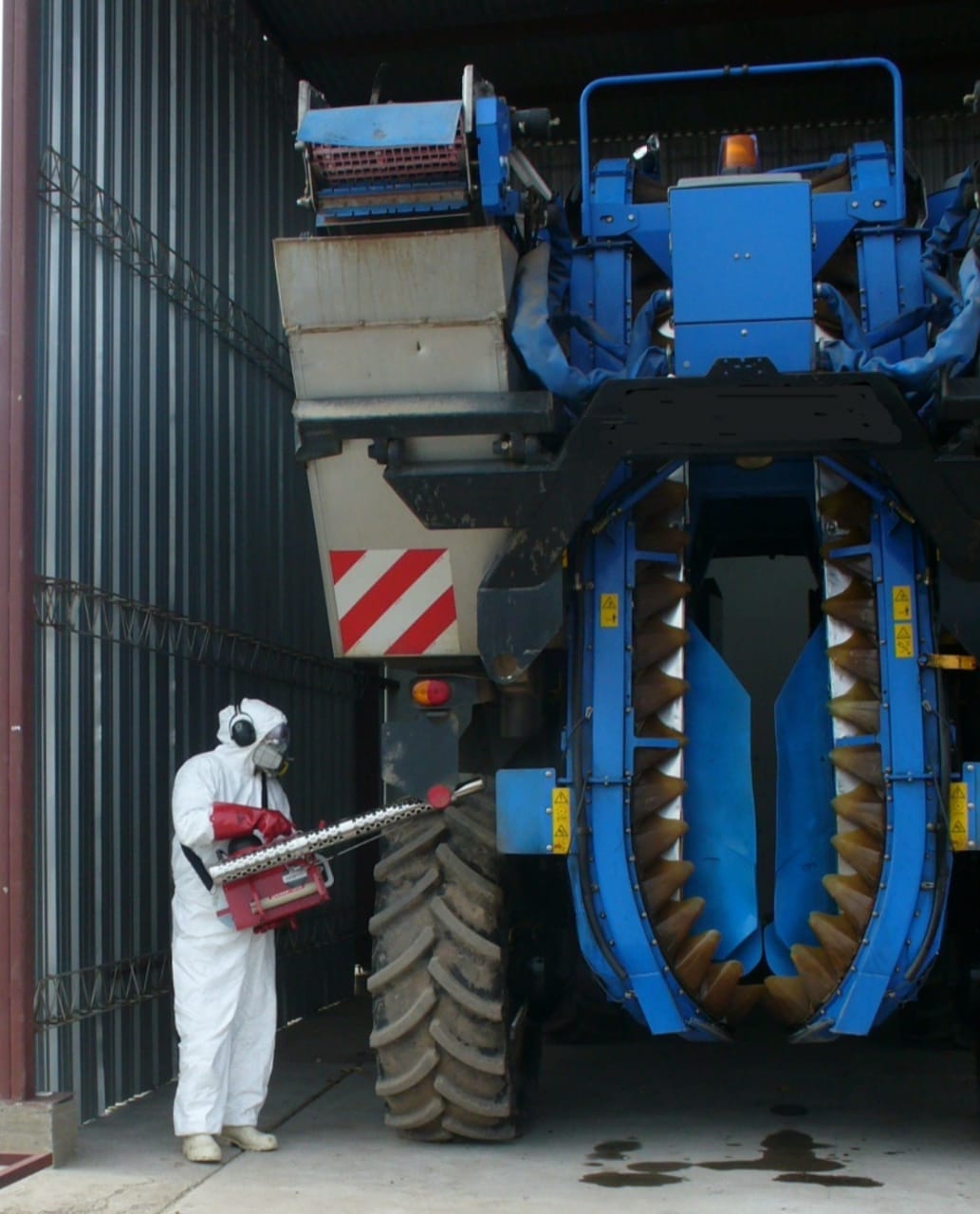 Una de las pocas empresas integrales sanjuaninas que puede desinfectar las máquinas cosechadoras de uvas, cumpliendo con todas las reglamentaciones y protocolos pedidos para trabajar en la campaña nacional contra la Lobesia botrana, "polilla de la vid".