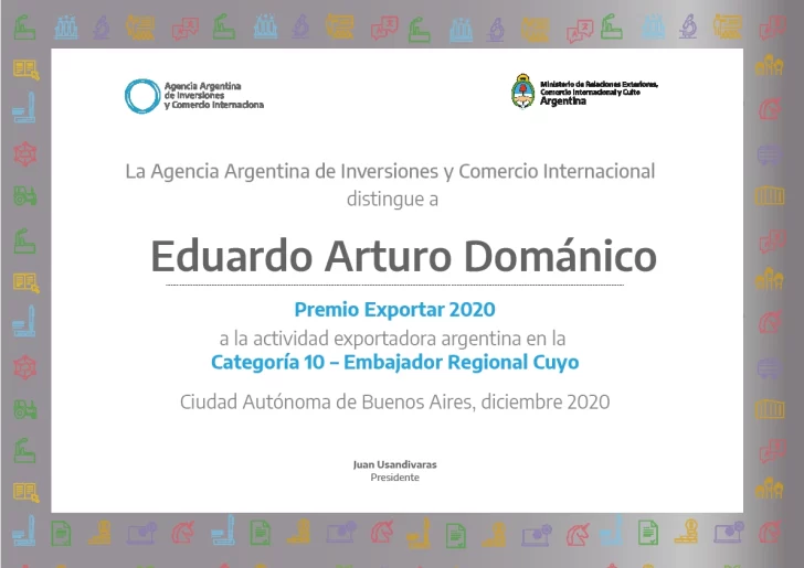 Según señala la comunicación oficial de Cancillería sobre la distinción señala textualmente lo siguiente: "Como se le ha comunicado desde la Agencia Argentina de Inversiones y Comercio Internacional, su empresa ha sido seleccionada como ganadora de la 25º Edición del Premio Exportar en la Categoría 10: Embajador Regional Cuyo".