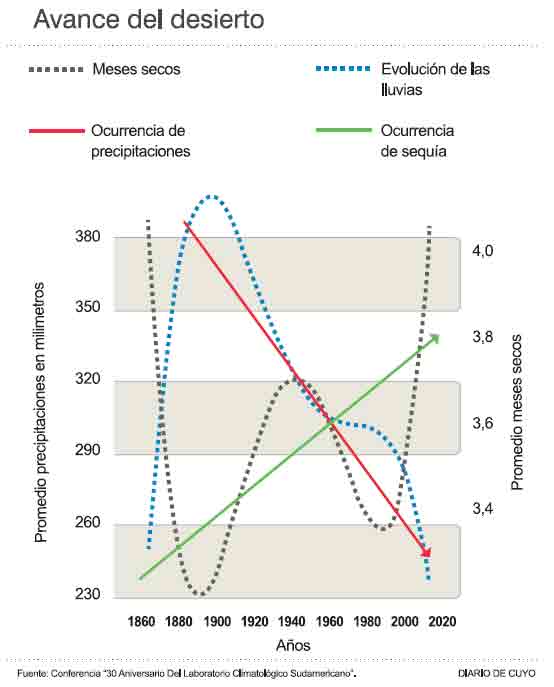 Pero luego con los datos históricos recabados por el Laboratorio Climatológico Sudamericano y también instituciones internacionales como la NASA, analizó el problema de la variabilidad y cambio climático. Hizo referencia al país y la provincia de San Juan, en temas específicos que hacen a la cuenca del río San Juan sensible a los eventos ENSO -El Niño Oscilación del Sur-, PDO -Oscilación Decadal del O. Pacífico-, indicando que la tendencia es menores precipitaciones níveas en la cordillera y con ello, derrames inferiores hacia nuestros valles; concentrados en menos meses, tal lo indicado por el gráfico de precipitaciones y meses de sequía en esta página sobre la cordillera central de Chile y Argentina.