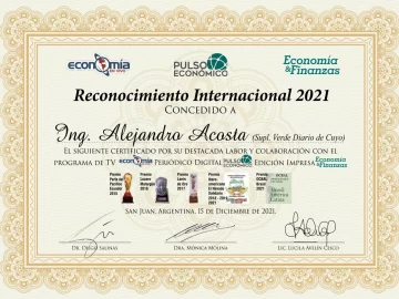El contador y periodista económico Diego Salinas envió esta semana la siguiente nota a Suplemento Verde de Diario de Cuyo distinguiendo a los periodistas agrarios Alejandro Acosta y Adrián Alonso: "Tengo el enorme placer de brindar este reconocimiento por sus aportes invalorables para con nuestros medios de difusión "Econom ía en Vivo" de Canal 4 Jesús Televisión, "Econom ía y Finanzas" y "Pulso Económico" durante este 2021, deseando que sigamos juntos este próximo 2022 ".