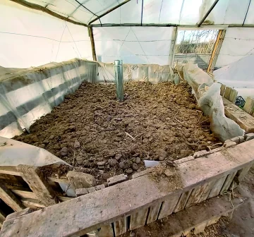Ya metiéndonos en el tema de hoy, ellos han probado distintas maneras de calentar las naves de invernaderos, siempre con el método de "prueba y error" como cuentan Pedro y Lucía. "El año pasado, hicimos una estercolera externa, con guano y restos, de unos 10 metros de largo, por unos 2 de ancho, por casi 2 de alto. En su interior, serpenteando, colocamos una manguera flexible (de las usadas comúnmente en bodega), y en dos alturas diferentes, ubicamos las salidas, para adentro del invernadero. Los primeros días, funcionó espectacular, hasta que, cuando más calor necesitábamos comenzó a escasear el aire caliente. Reformulamos todo (con el sistema que veremos luego) y al desarmar el sistema, descubrimos que por el peso, por el calor y por la presión, la manguera se acható y se cerró".