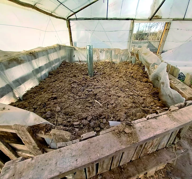 Continúan diciendo "hoy trabajamos con 3 composteras, una a la entrada de la nave, otra al medio y otra al fondo, que tienen un caño metálico, que elevamos del piso, que abajo toma el aire frío y arriba libera (luego del paso por la mezcla) del aire caliente. Es económico y simple. Lo bueno es que es doble propósito, el guano calefacciona en invierno y en tres meses, se hace compost, que reutilizamos en otros canteros, macetas y viveros".
