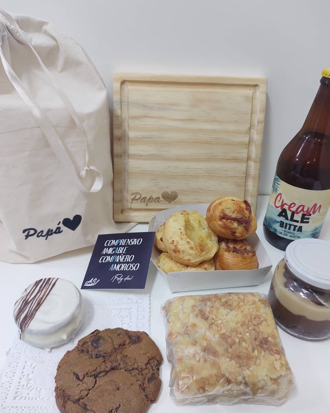 La particularidad de este regalo es que Anabella Sansone, técnica en gestión gastronómica y propietaria de la pastelería, se reunió con otros emprendedores para poder agasajar a papá en su día, armando un súper box que contiene: un plato de madera para asado, una cerveza 500ml de "Bitta Brewhouse", 3 chipás de 4 quesos de “La Chiperia”, 3 rolls de queso y salame, un cuadrado de manzana y crumble con maní, un alfajor relleno de chocolate blanco, cookie americanas con corazón de dulce de leche, un postre en frasco marroc; además una bolsita de lienzo pintada a mano y una tarjeta de “Mi Diseños”. El mismo tendrá un costo de $2.000.