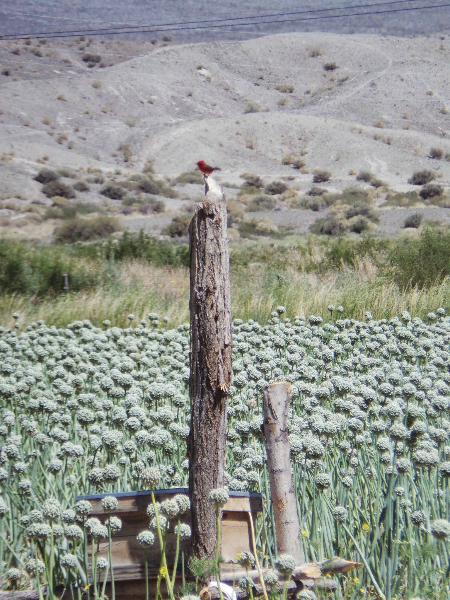 Un lote de semilla de cebolla, producido en forma orgánica, y certificada, en un valle sanjuanino. Nótese el pechito colorado, que da idea de ausencia total de agroquímicos y venenos. Además, la colmena en plena polinización. Silvestre y natural.