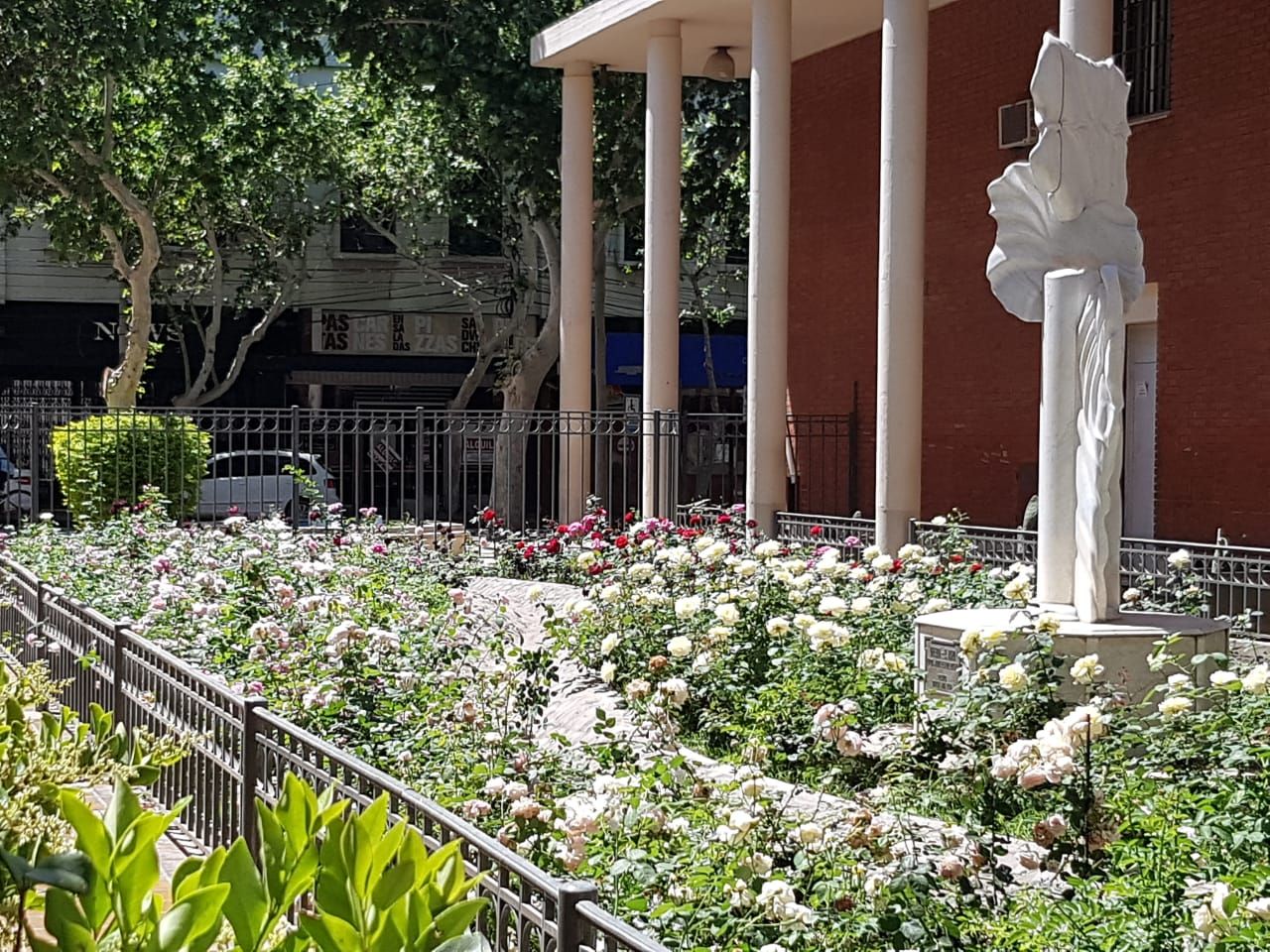 Octubre es el mes en que estalla de flores, se trata del Rosedal ubicado entre el Banco San Juan y La Catedral. Es un pequeño paseo donde converge en plena armonía dos mundos el espiritual y material. Este nació por iniciativa del Ing. Enrique Ezkenazi, amante de las rosas, en el año 2014 y se concretó en el 2015. La obra de cultivo lo realizó la Sra. Valentina Casucci, Paisajista y Rosicultora de la Asociación Argentina de Rosicultura de Buenos Aires, gran amiga del Ing. Enrique Ezkenazi. Hoy Valentina descansa en paz. El Vivero Regalería Verde, es quien hizo el trabajo de colocar y preparar la tierra y plantar los rosales. Inicialmente se plantaron 800 rosales en la actualidad cuenta con 640 plantas de rosas. Sin lugar a dudas este espacio le dio vida a un sitio complicado por las horas de sol que requieren estas especies y además por estar entre dos estructuras muy grandes.