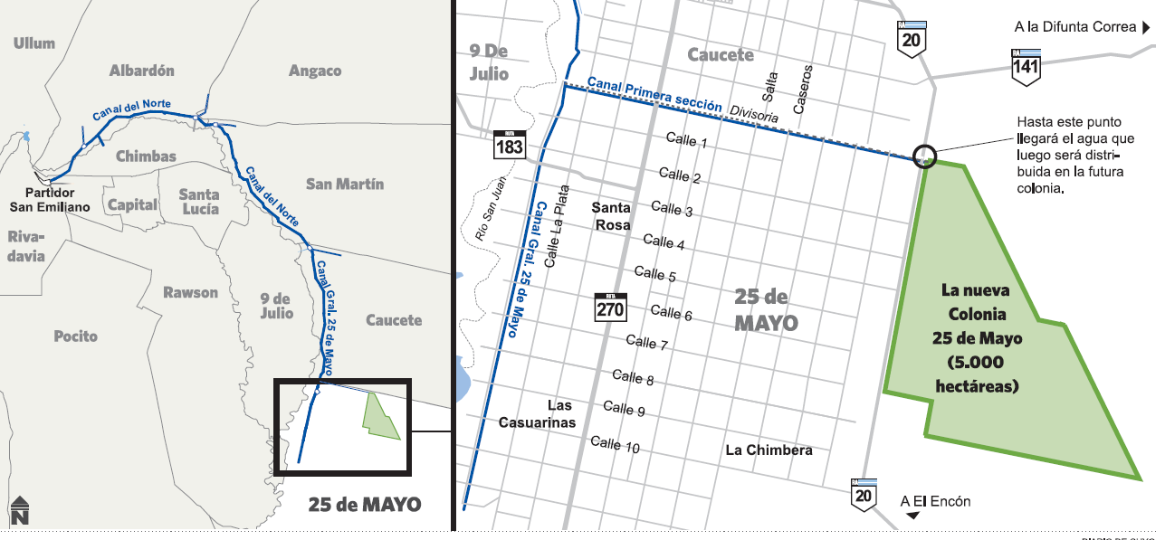 El polo de desarrollo productivo en 25 de Mayo cuenta con el decreto Nº0610-1981 donde se le otorga un derecho de agua para 4.149 hectáreas.