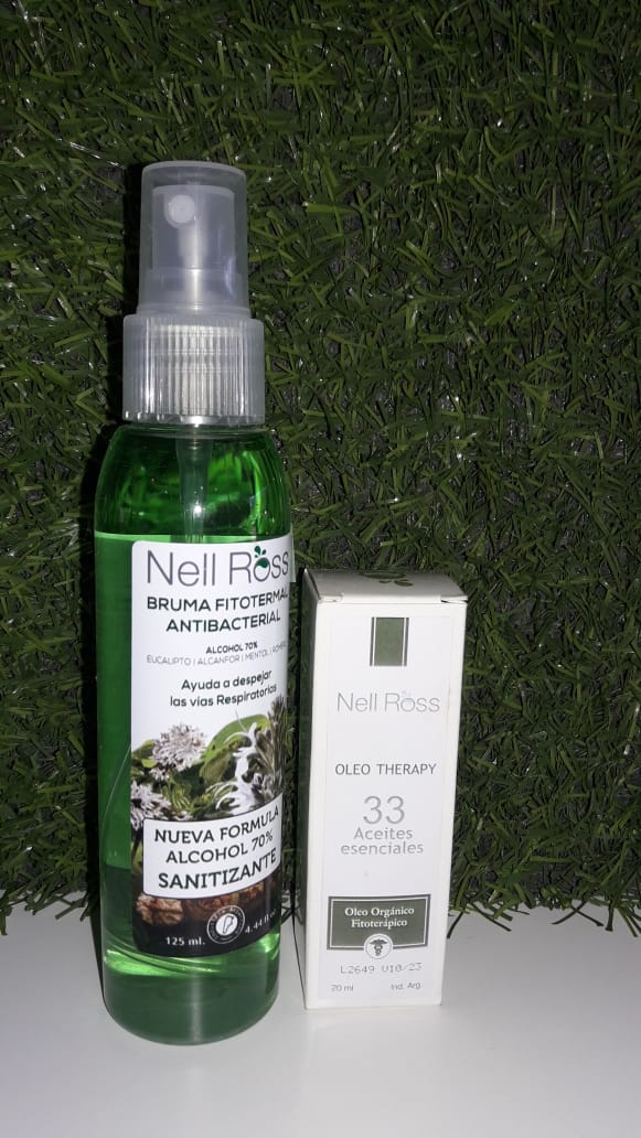 Bruma antibacterial sanitizante: 690 pesos. Oleo orgánico therapy con 33 aceites: 1090 pesos