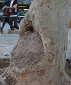 Conjuntamente se realizó un diagnóstico general de los árboles, en base al que se pudo observar que existían en la base del fuste, profundos huecos producidos por el continuo golpe de los vehículos y por ataque de hongos que degradan la madera muerta. También había presencia de hormigas, nidos de cucaracha y roedores. A partir de este diagnóstico se tomaron medidas para frenar el avance de los daños y salvar estos ejemplares de una erradicación por los peligros de caída que presentaban. El tratamiento que se realizó, respaldado por el asesoramiento del Ingeniero Agrónomo Lucio Gómez y el actual grupo de profesionales con el que cuenta el Municipio, incluyendo las sugerencias del Ingeniero Agrónomo Ricardo Chipitelli, fue la limpieza y remoción de todo material suelto, poroso, débil e infectado. Luego se desinfectó con dióxido de cloro y se fumigó interiormente con un fungicida (sulfato de cobre) para el control de hongos y bacterias. Cabe resaltar que, el centro de cualquier árbol (xilema viejo y médula) está muerto y cuando se lastima la parte externa hasta llegar a estos tejidos, permite el ingreso de microorganismos que degradan la madera muerta y de hormigas que van perforando el mismo, perdiendo resistencia en esta zona, al punto de no poder soportar su propio peso. Por esta razón se agregó una mezcla de cemento, sin cal y ripio. También se le incorporó sulfato de cobre al agua de la mezcla, con el objetivo de evitar el desarrollo de hongos y bacterias en las probables fisuras que se producirían por la dilatación del cemento debido a cambios bruscos de temperatura y a la falta de adherencia entre los materiales adicionados y la madera. Dicha mezcla le confiere resistencia a la estructura del árbol, evita su erradicación, e impide la proliferación de guaridas de roedores y resguardo de insectos como cucarachas, entre otros. Esta mezcla es neutra y no produce ningún tipo de daño o degradación de la madera. Esta solución también se respalda en que el reemplazo de estos ejemplares arbóreos genera una gran dificultad para el desarrollo del árbol de reemplazo, ya que compite por luz y espacio con las especies contiguas, quedando como consecuencia, oprimido.